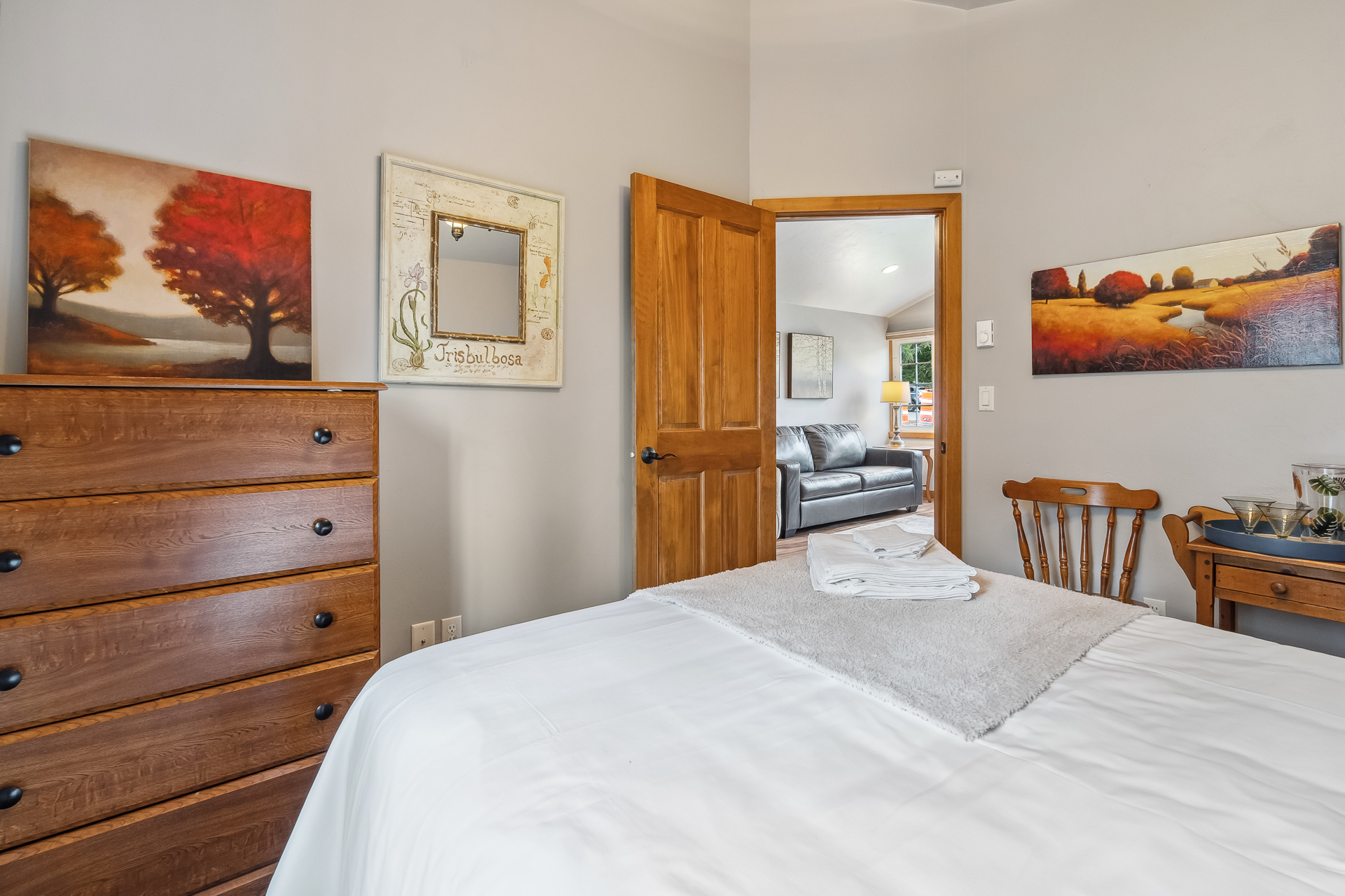 Bedroom 1 (main level): Queen size bed, hangers, extra pillows and blankets