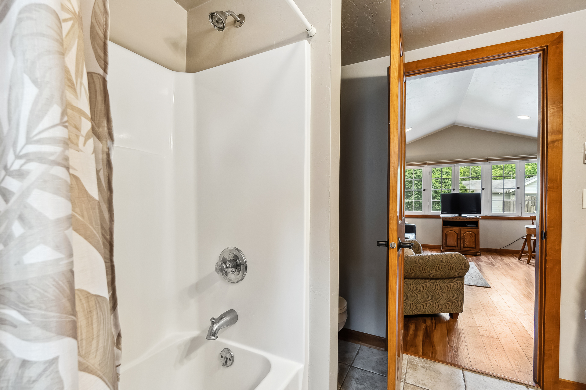 Bathroom (main level): Full bathroom with tub shower combo, hair dryer