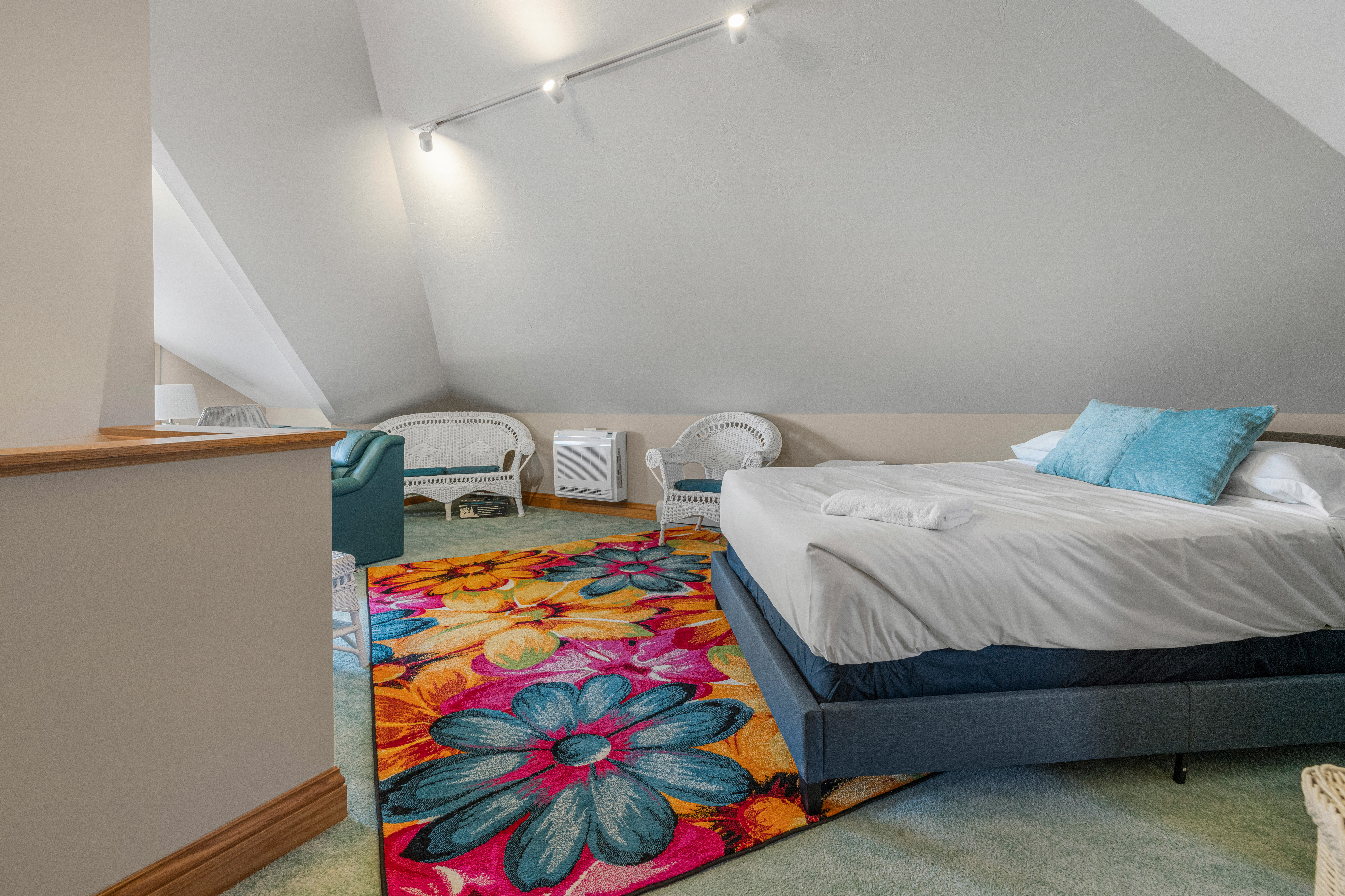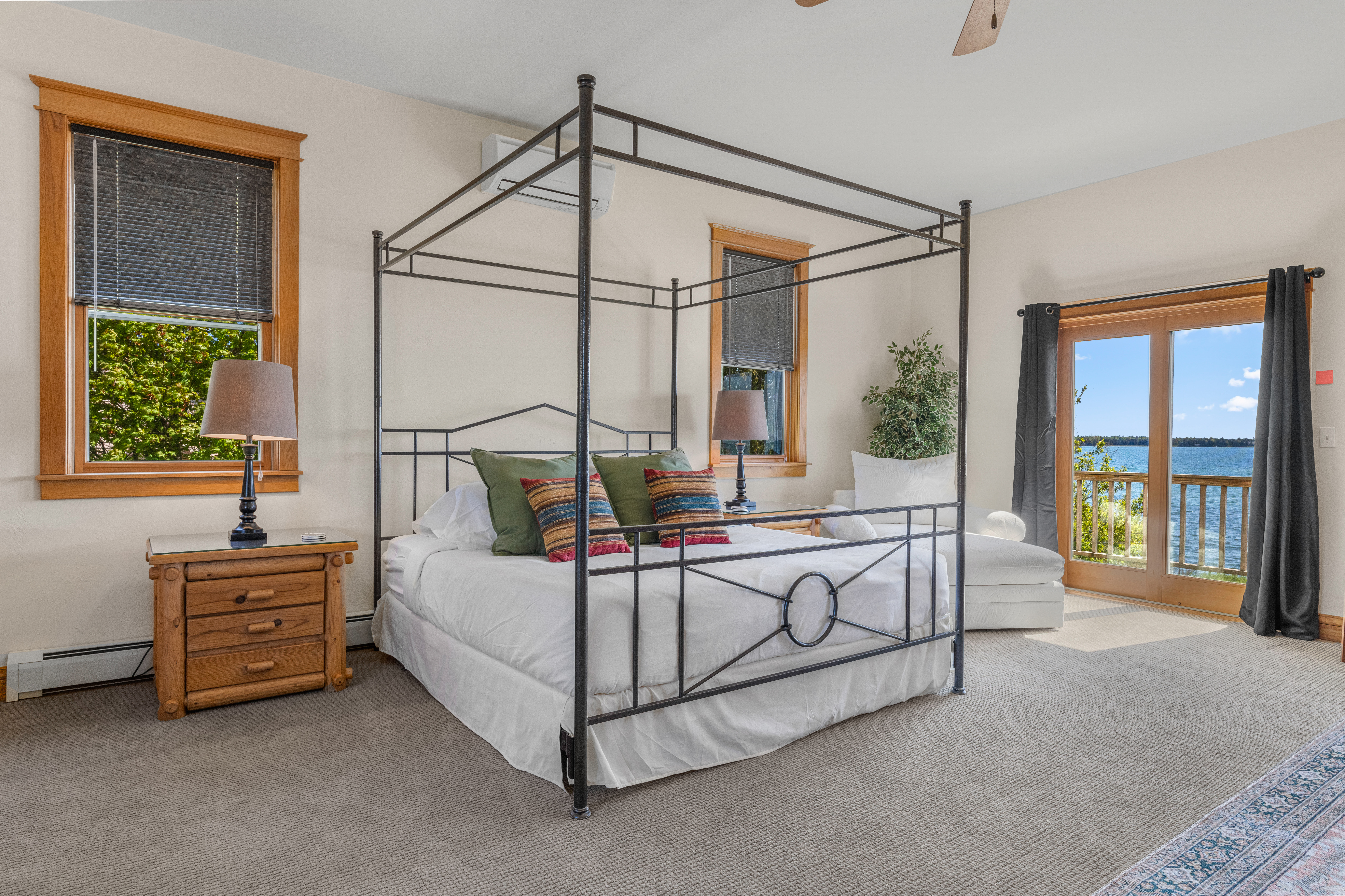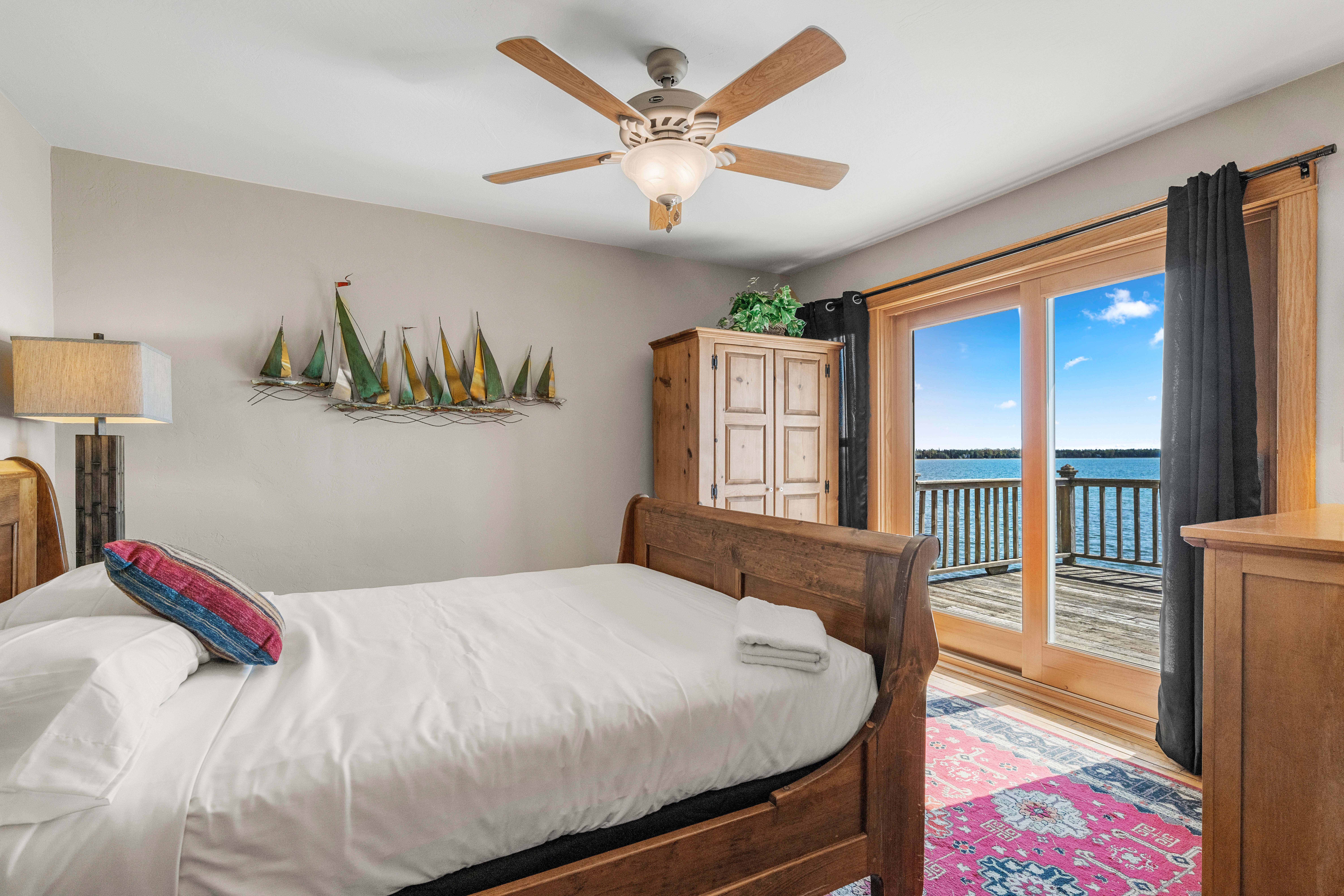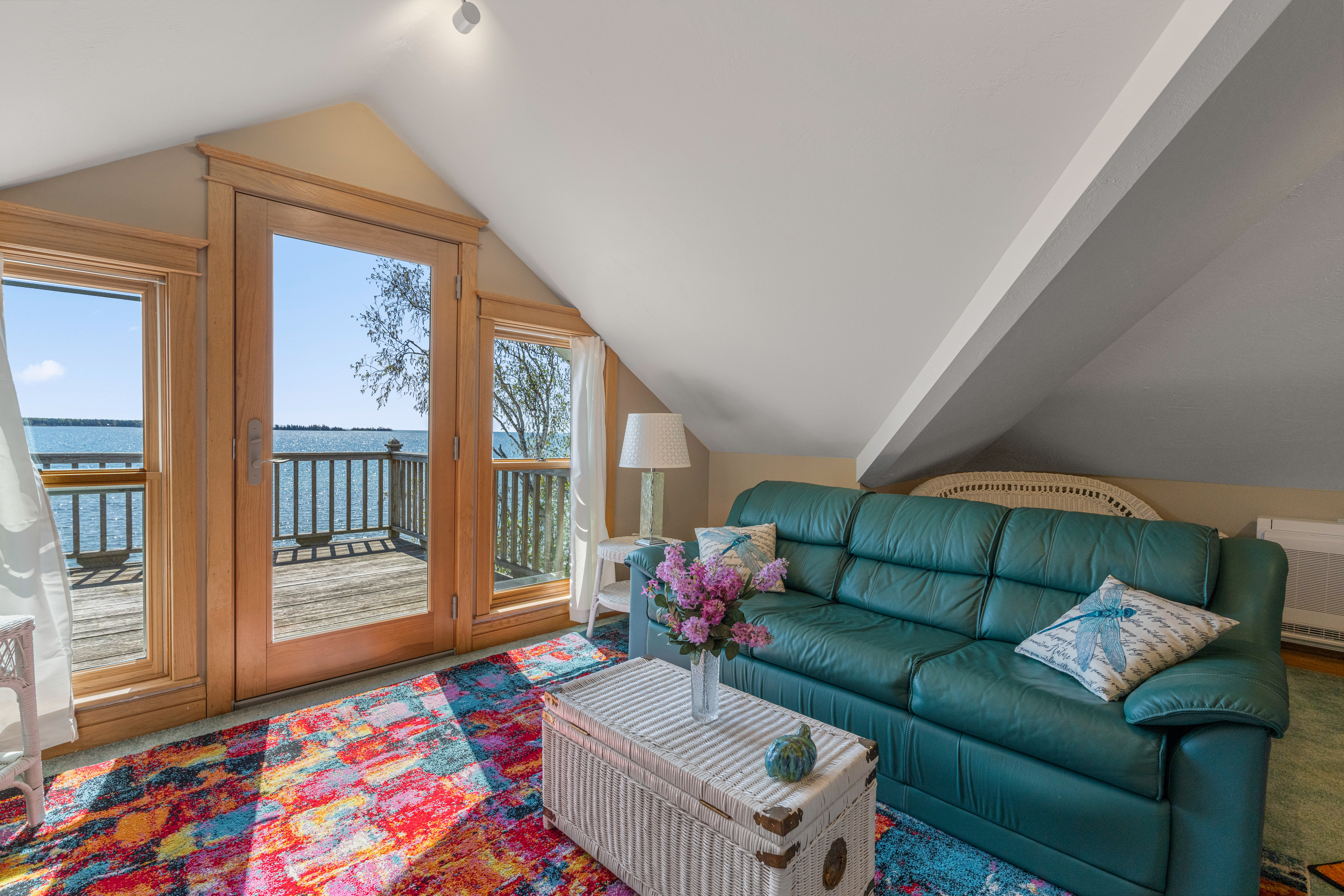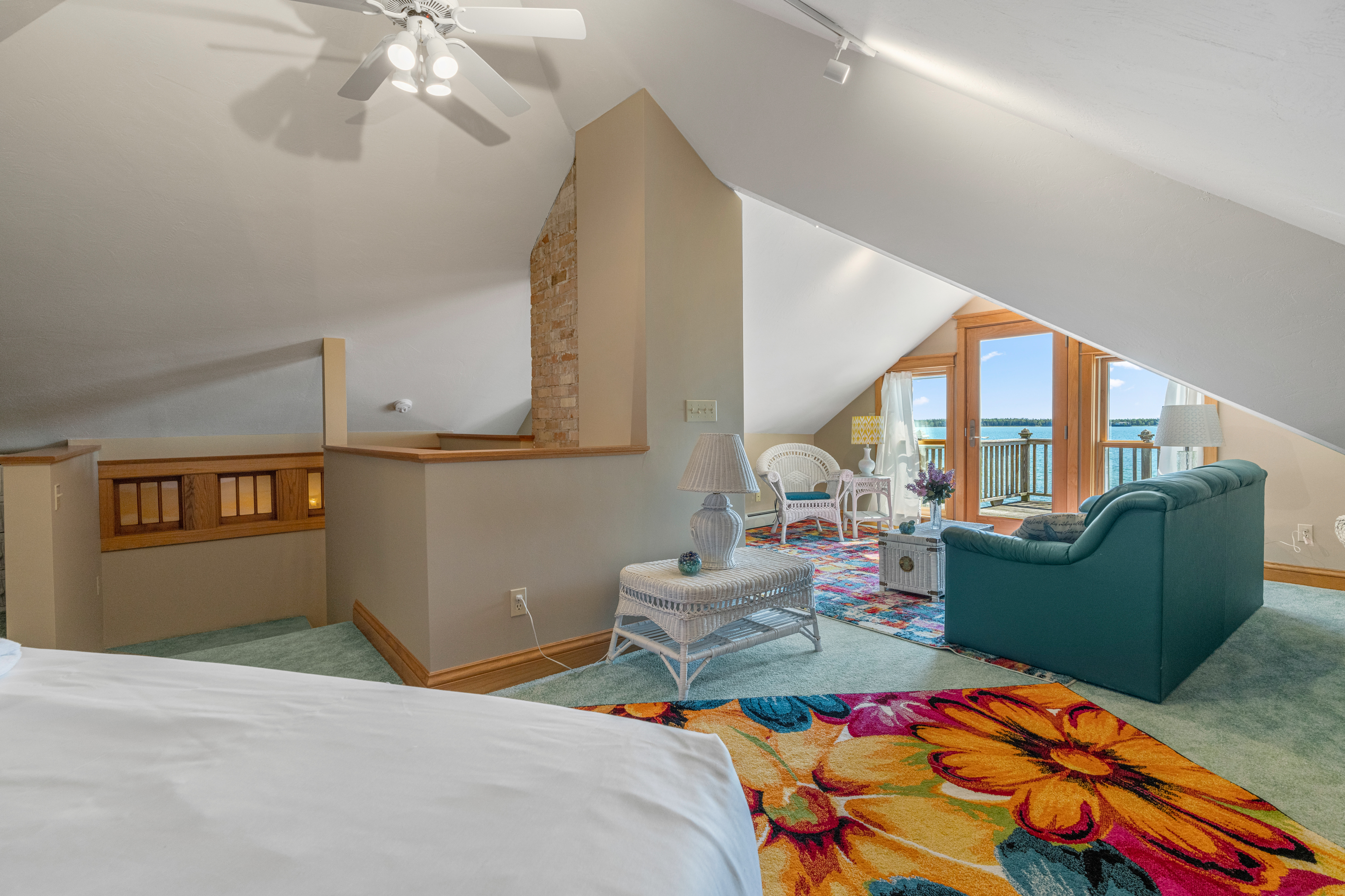 Suite 5 (third floor): Waterfront, queen bed, living space, private deck and pullout sofa bed for additional sleeping space; private full bath with walk-in shower