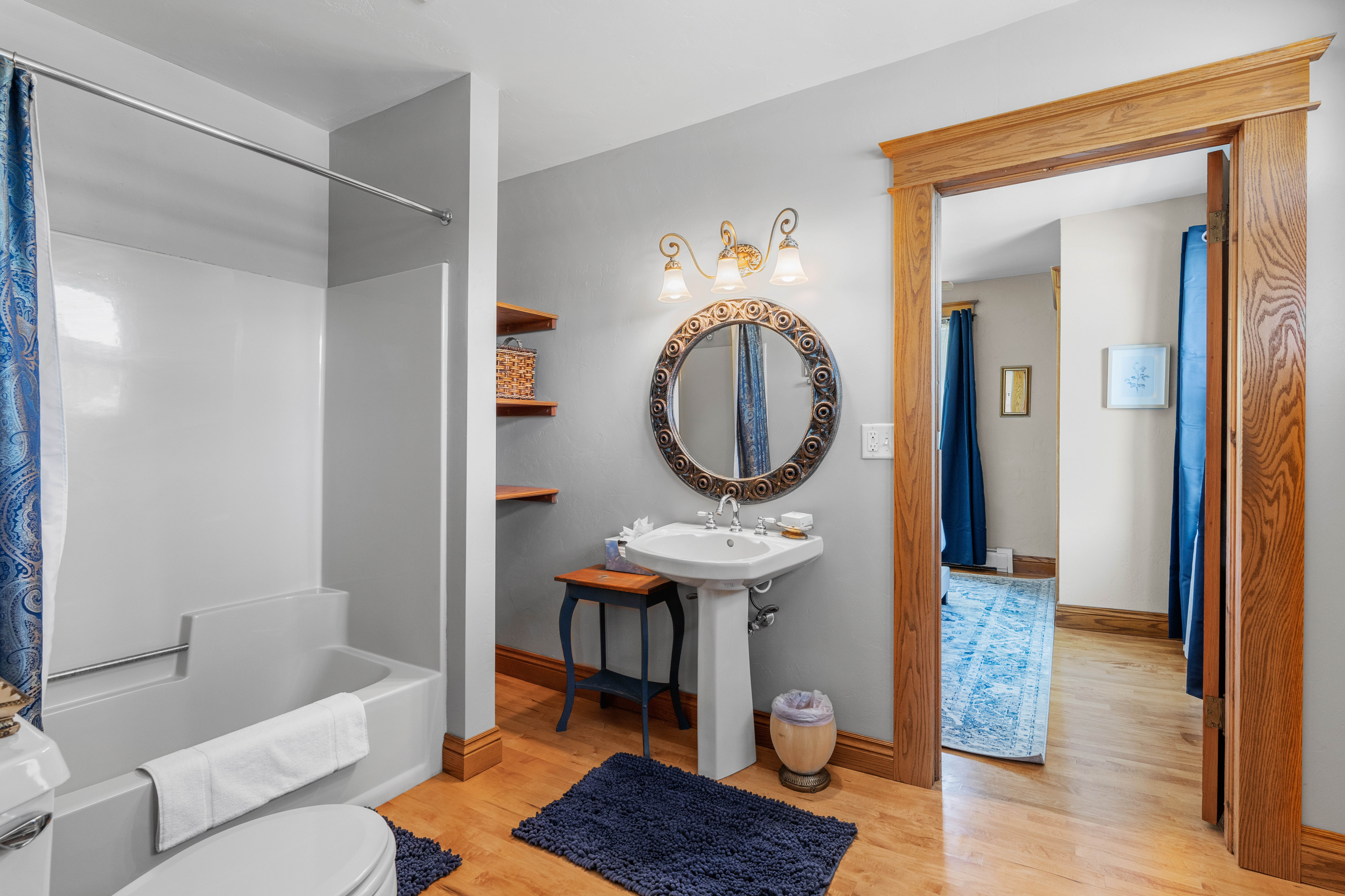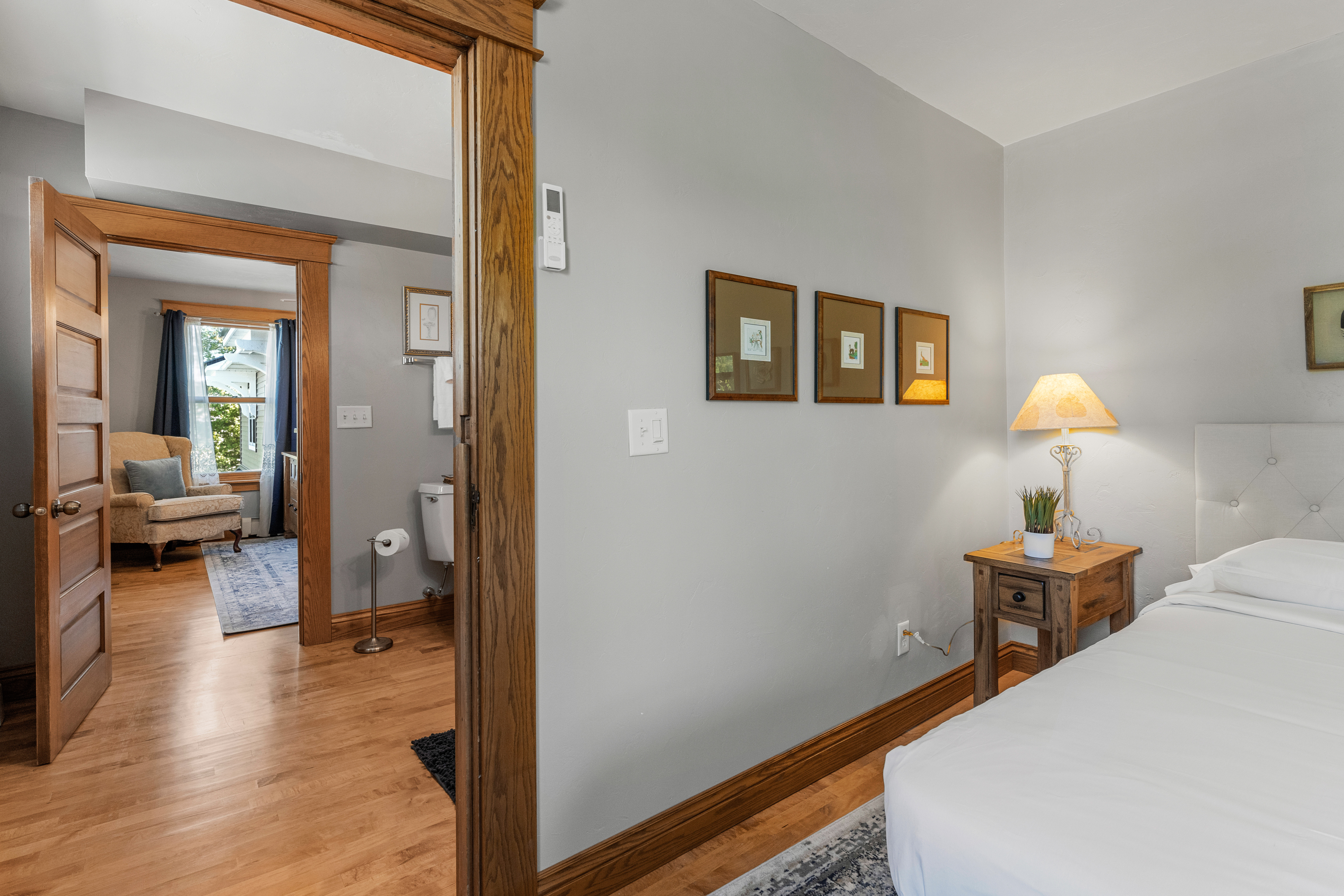 Suite 2 (second floor): 2 separate bedrooms each with a queen bed; shared full bathroom in the middle has a tub shower combo