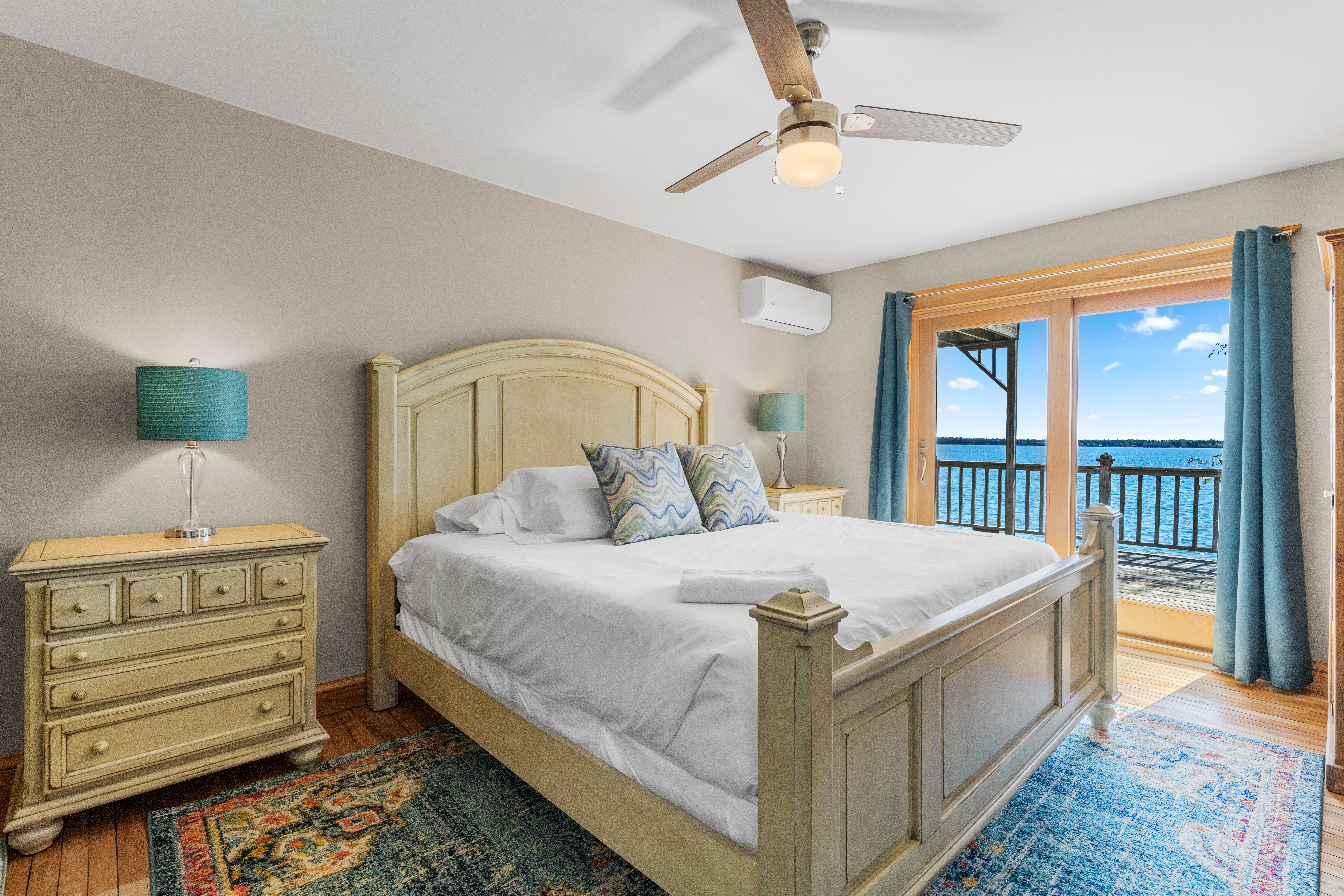 Suite 3 (second floor): Waterfront, king bed, shared waterside deck; private full bath with a tub shower combo