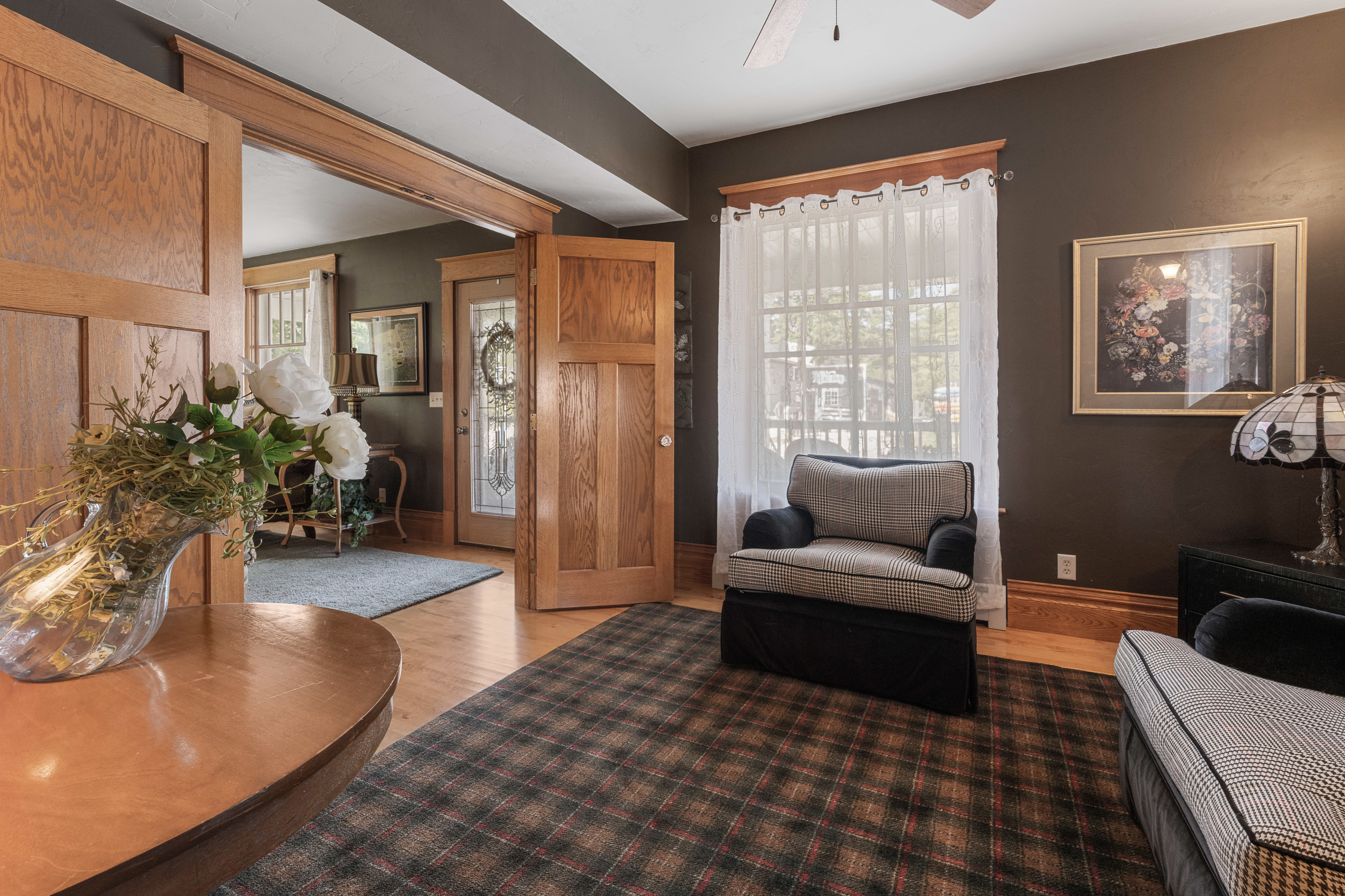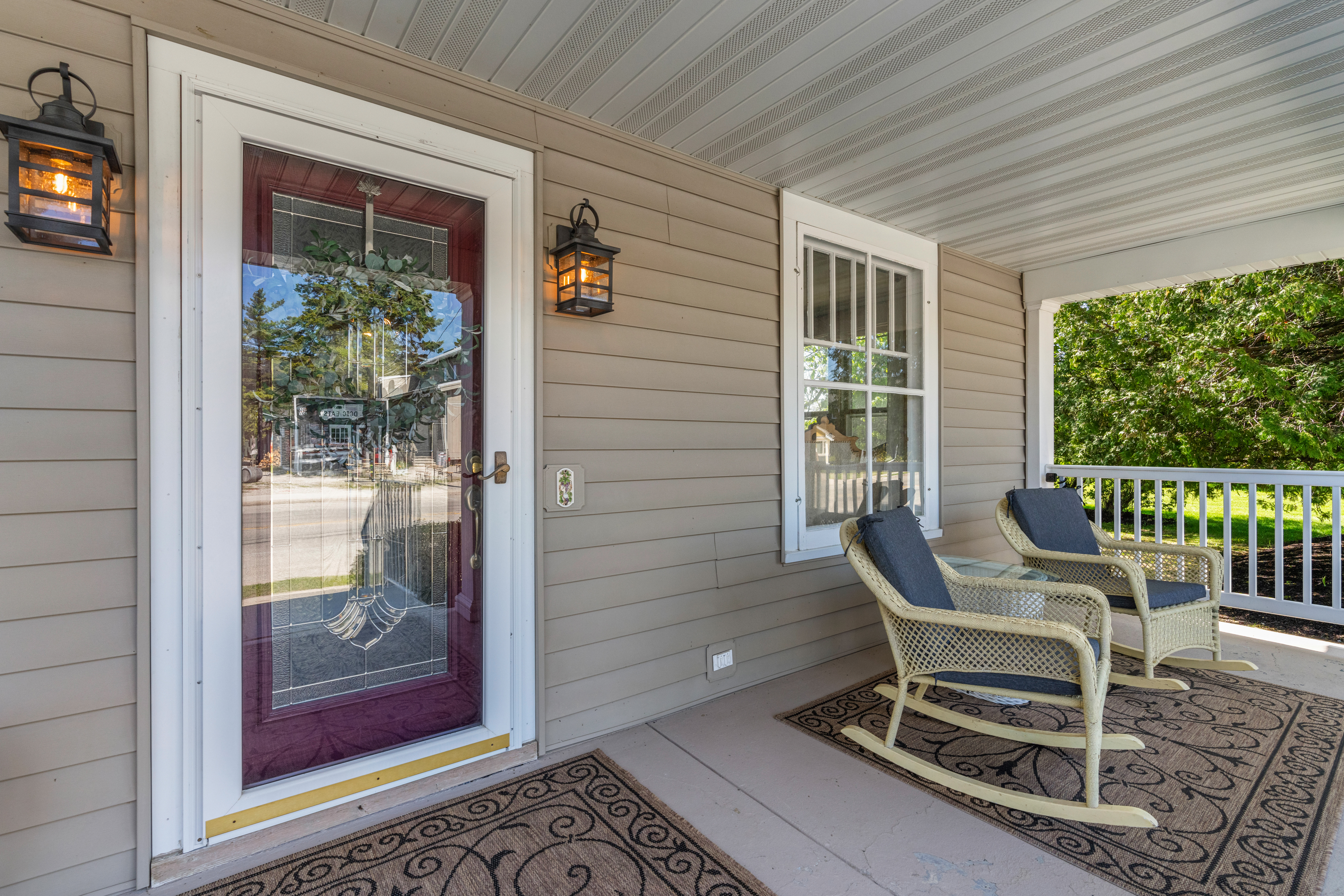 Large, covered front porch with 2 chairs and coffee table