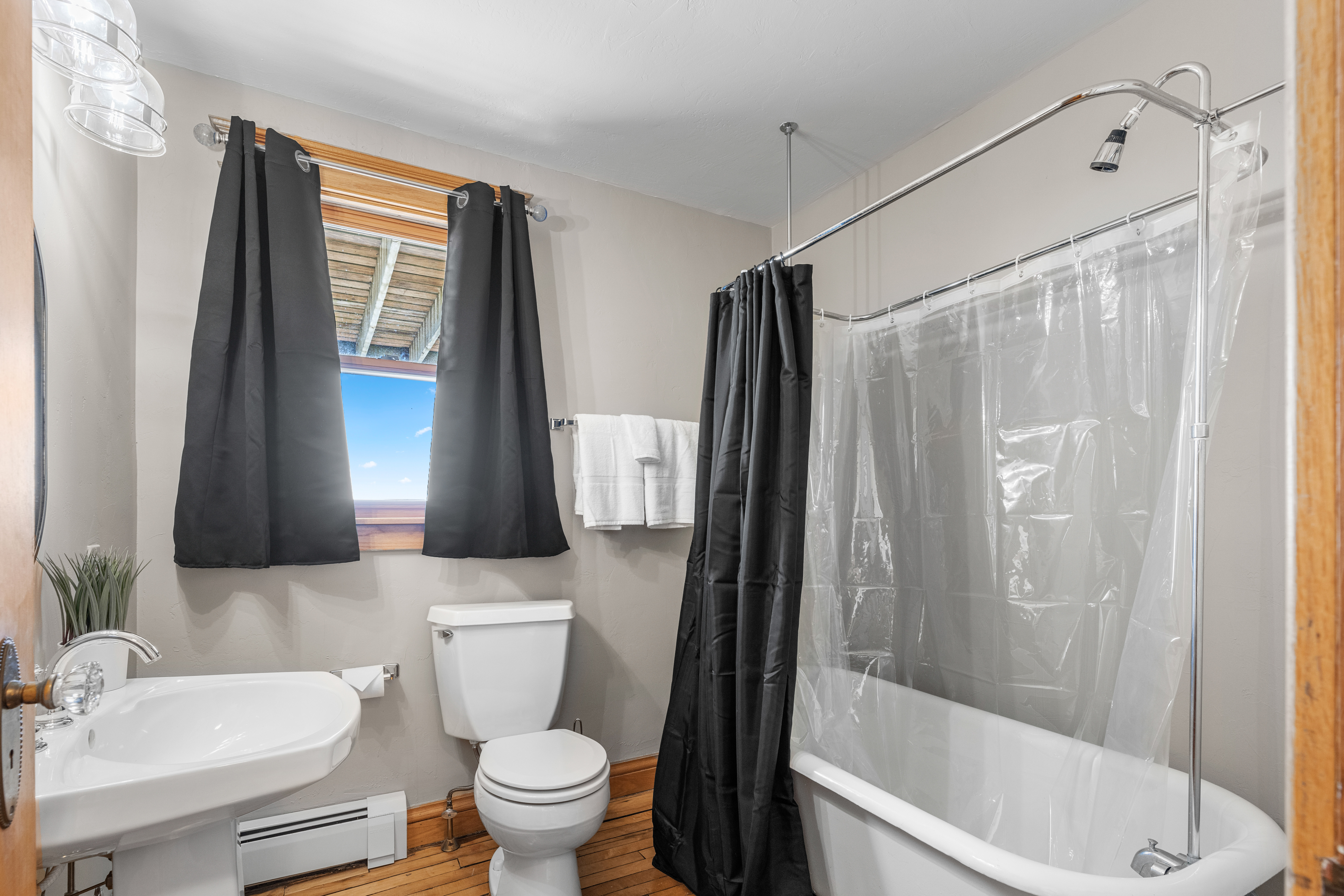 Suite 4 (second floor): Waterfront, queen bed, shared waterside deck; private full bath with original claw foot tub shower combo