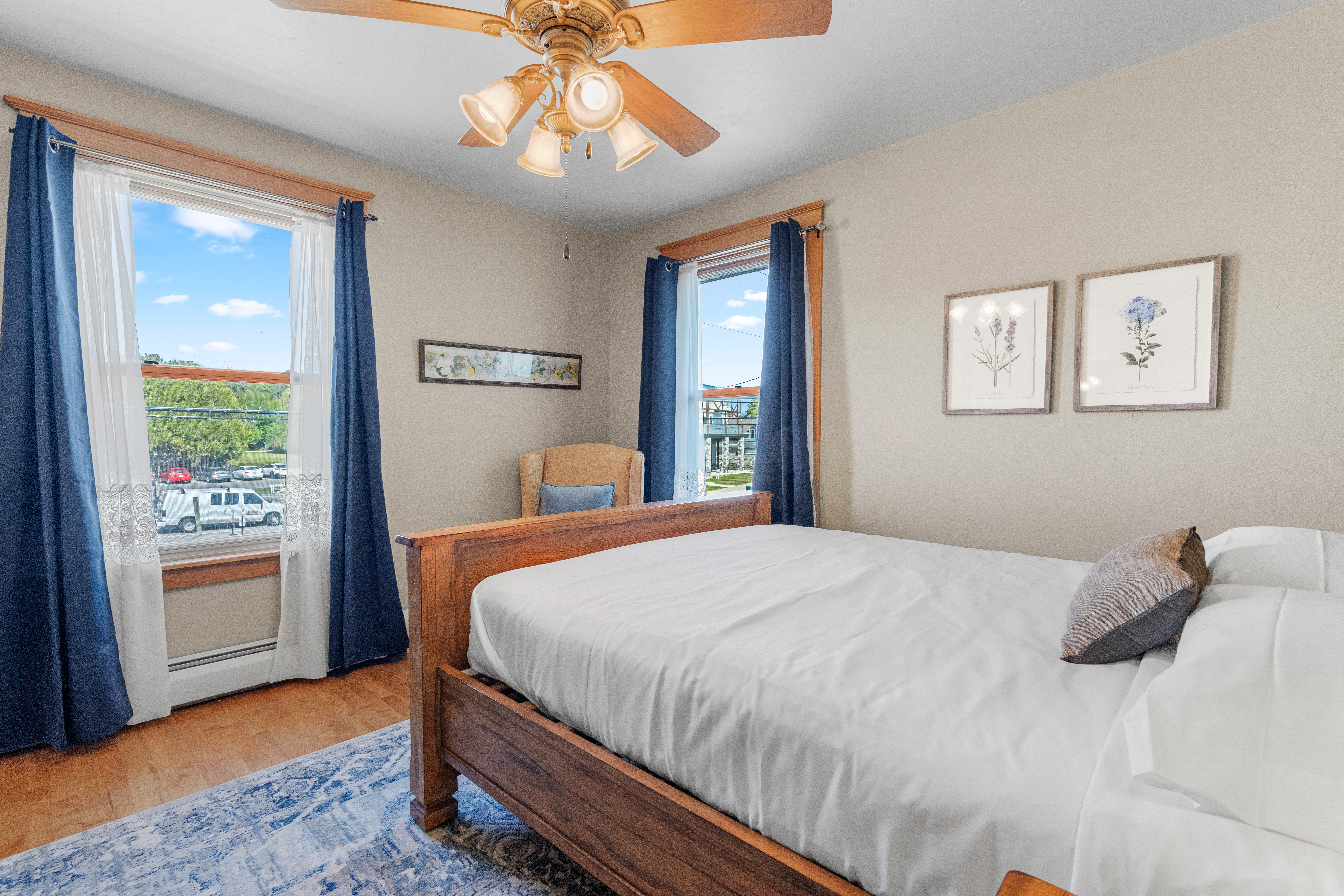 Suite 1 (second floor): Waterfront, King bed, ceiling fans, separate living room, wet bar area with beverage center and a workspace complete with desk and chair; private full bath with shower and double vanity sinks