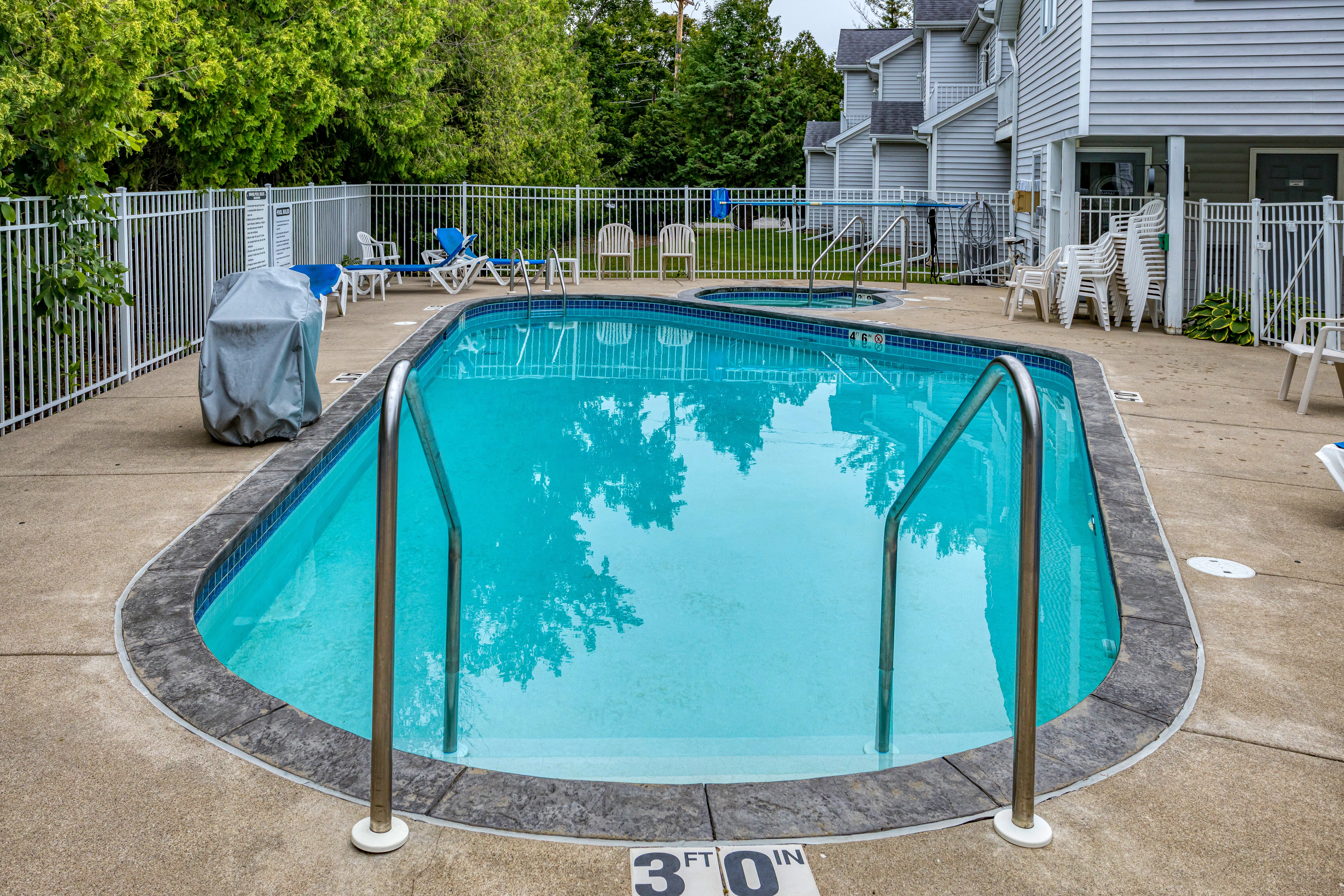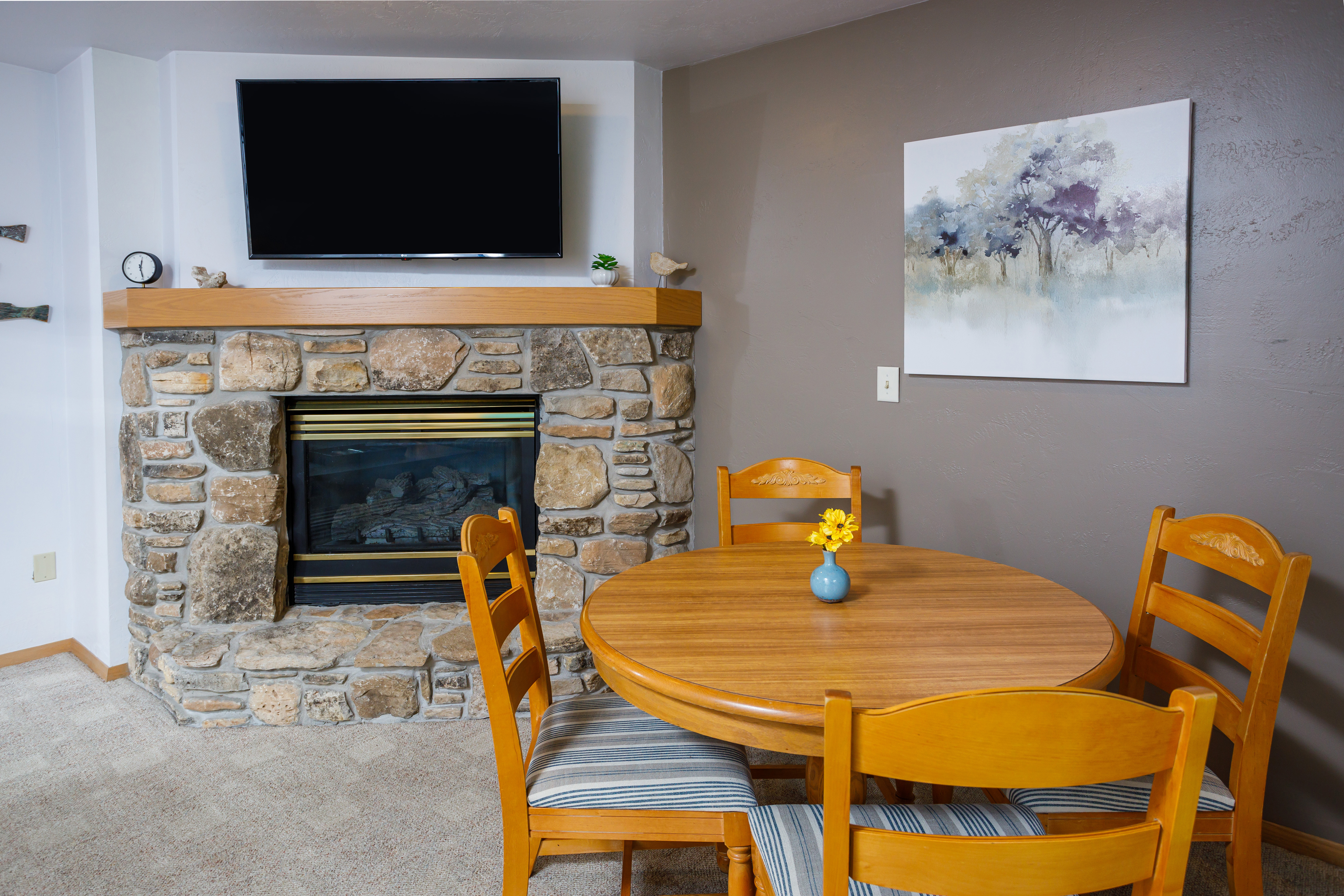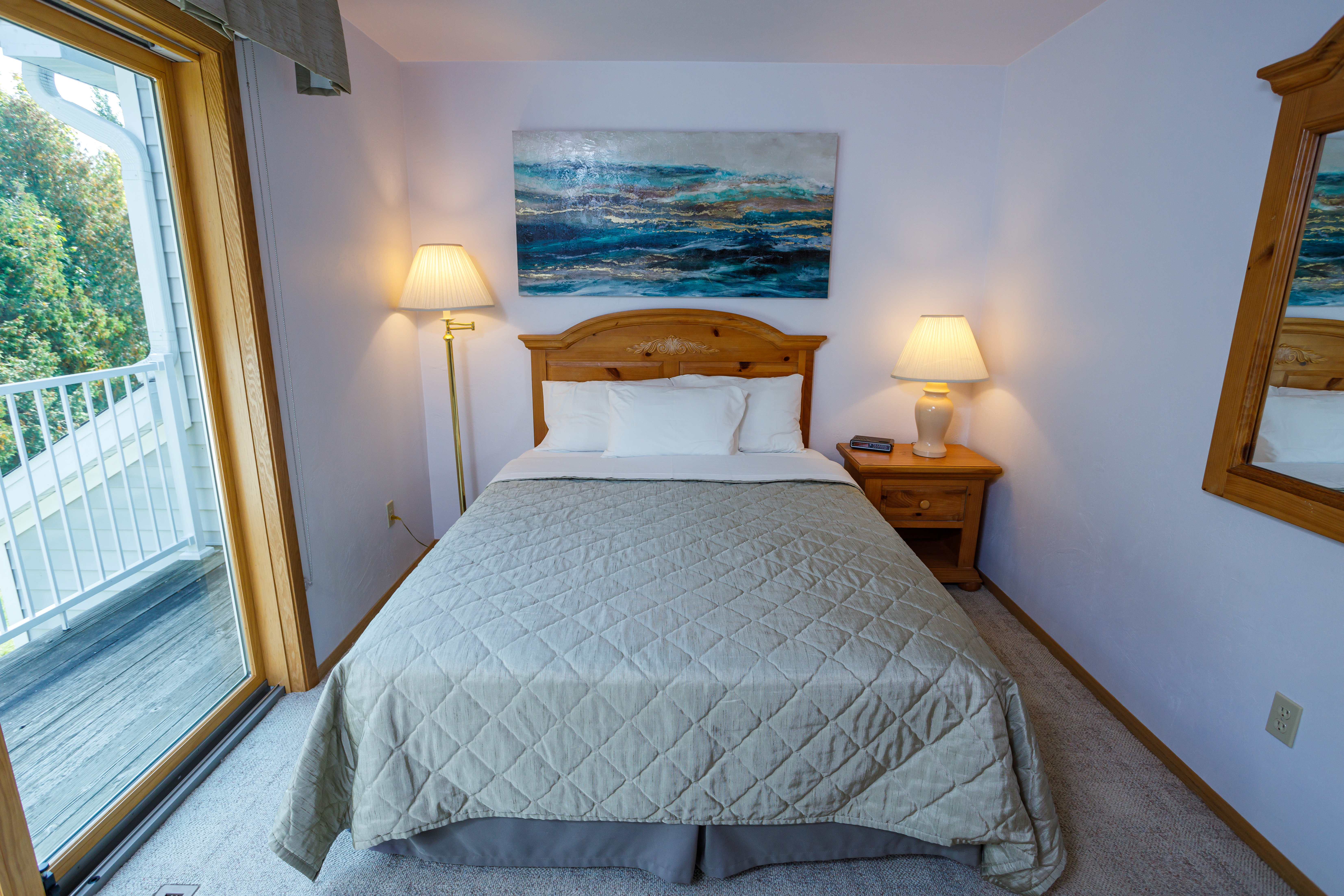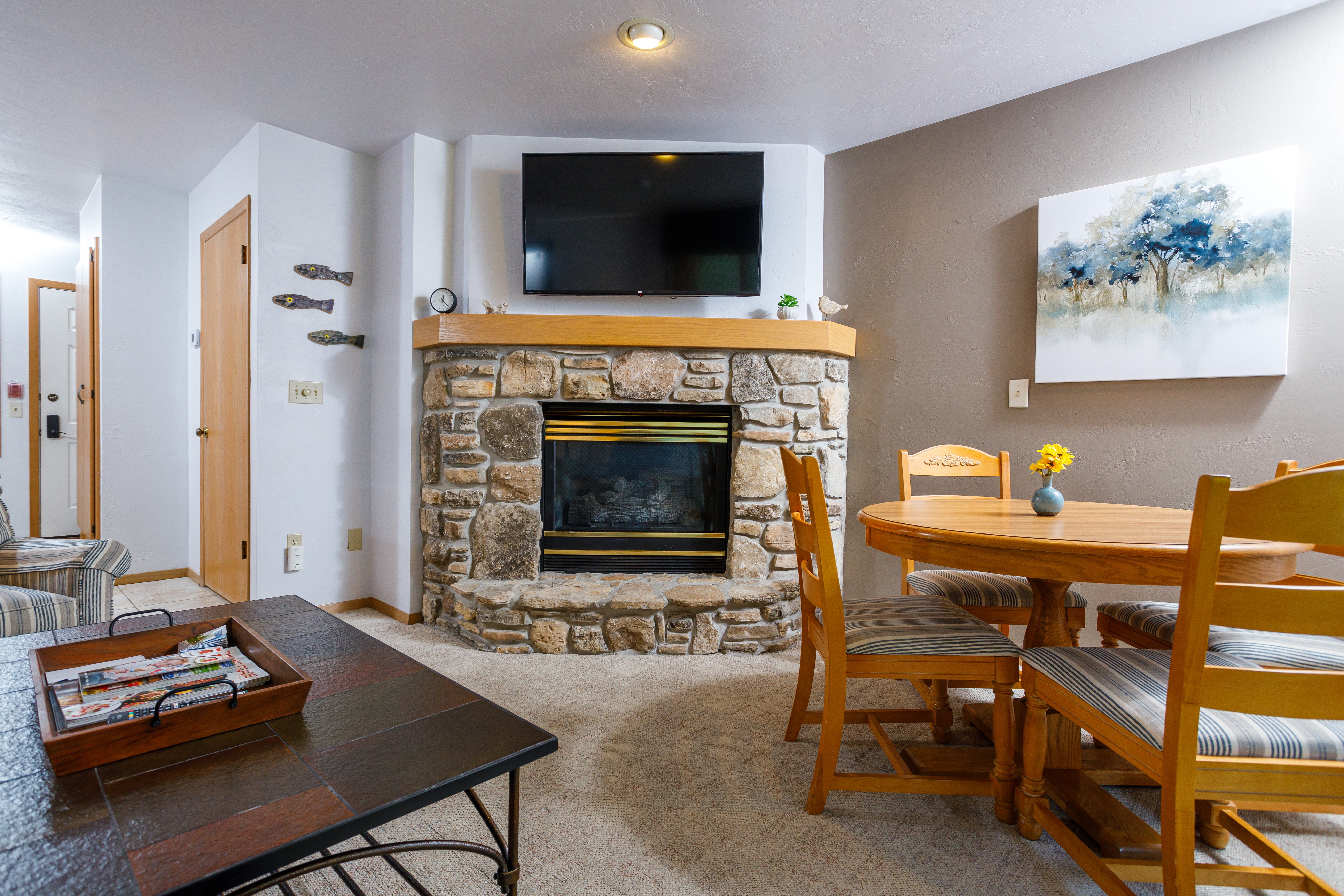 This two-story condo with a private entrance comfortably sleeps six with two upstairs bedrooms and a living room sleeper sofa. The first floor features a half bath, and the full upstairs bath boasts a spacious jetted tub. Want to eat in? Enjoy the fully-equipped kitchen. Catch up at the dining room table or relax in front of the large fieldstone gas fireplace while enjoying your favorite shows on the 52-inch smart TV. Step out onto the private 2nd-floor balcony or 1st-floor deck to enjoy a quiet morning cup of coffee. Take advantage of the heated pool and hot tub on the property, which is open Memorial Day to Labor Day.