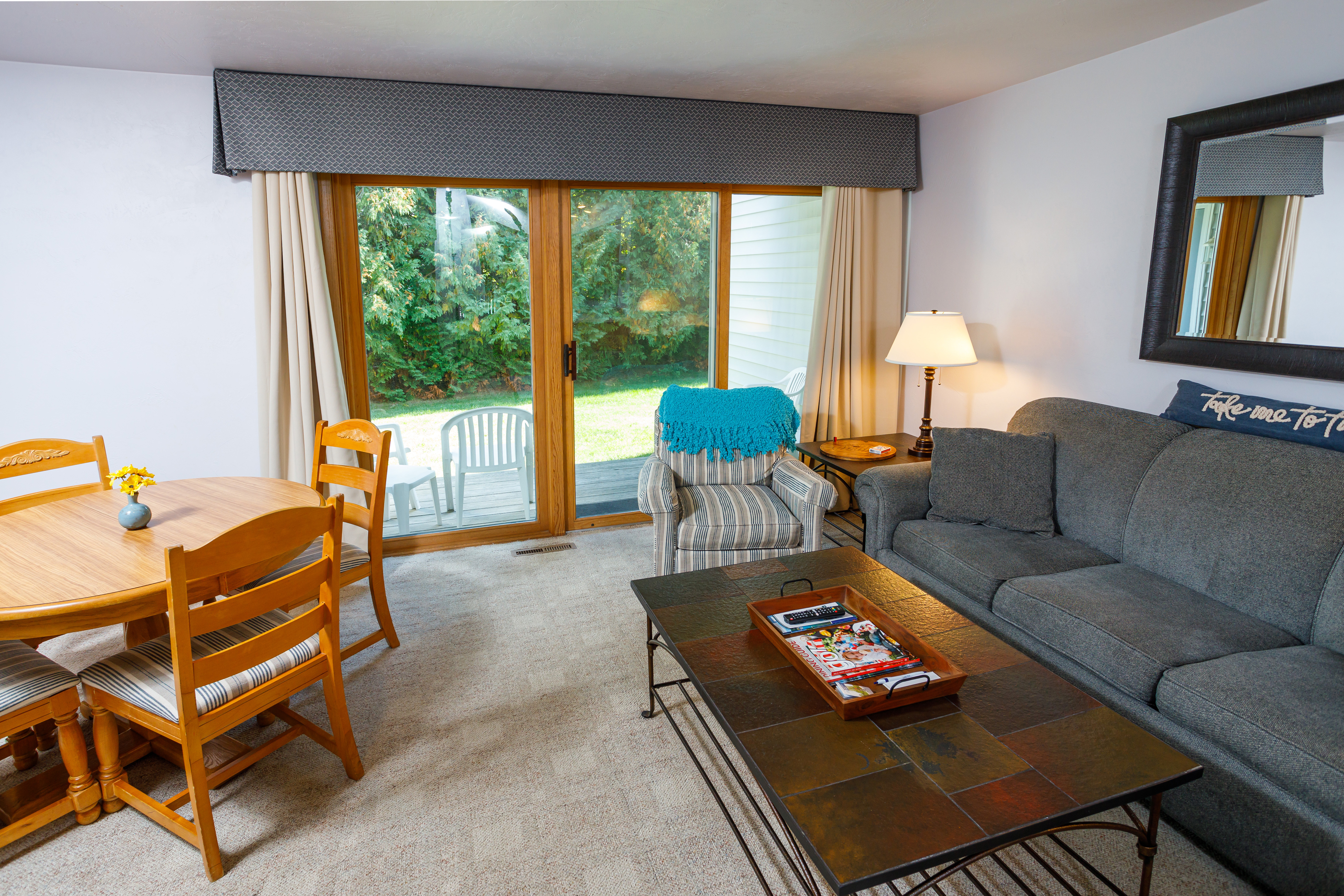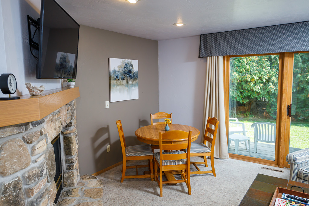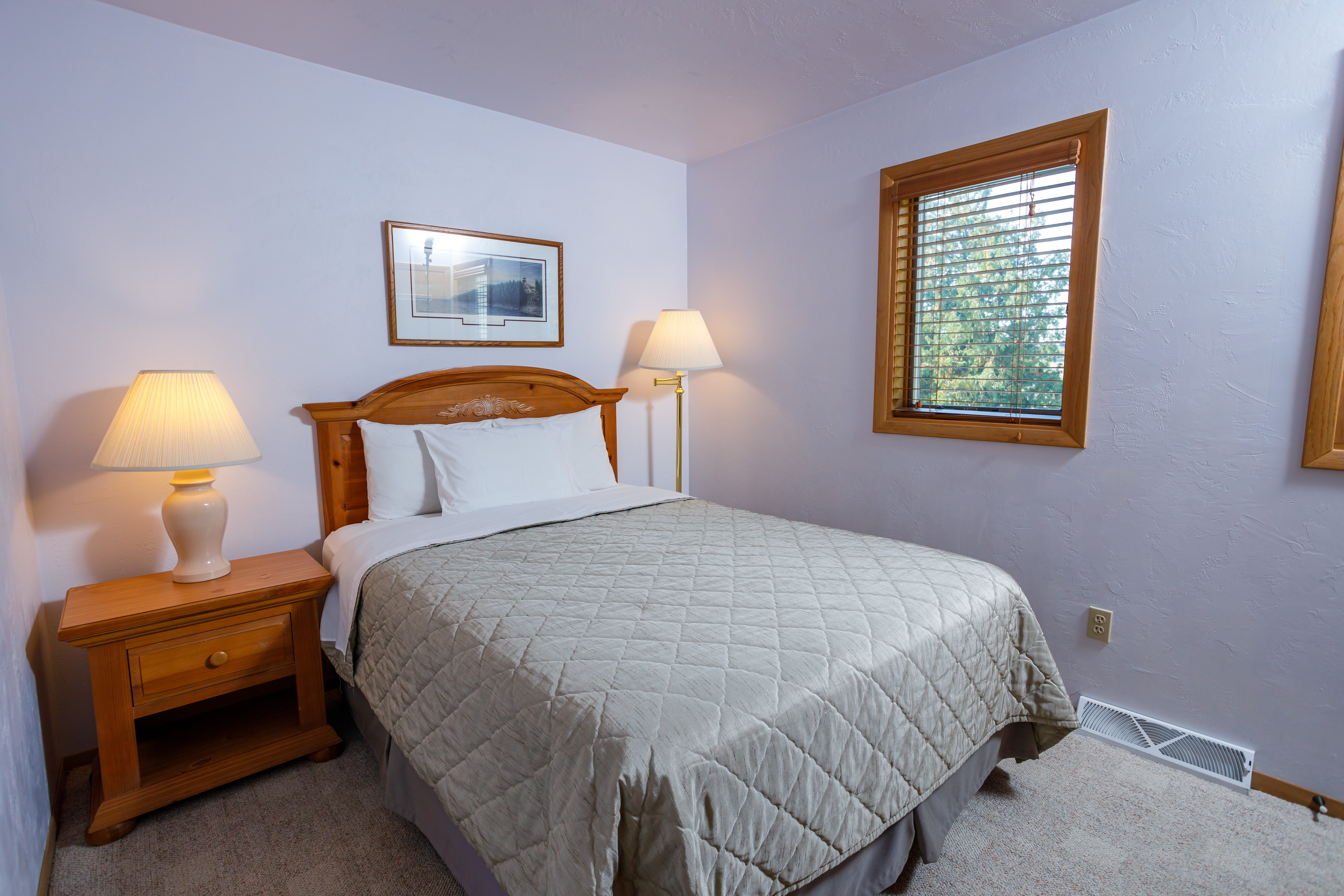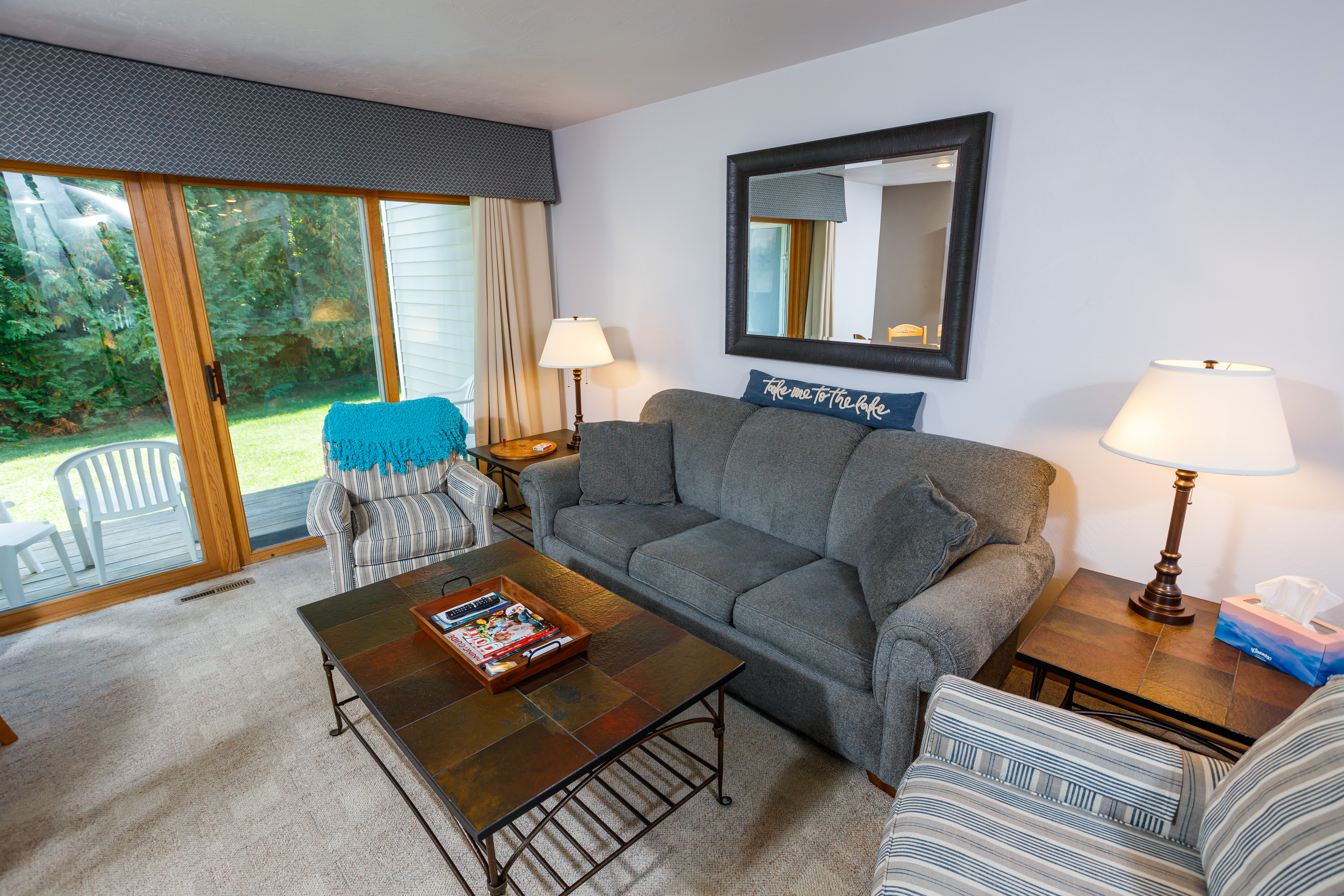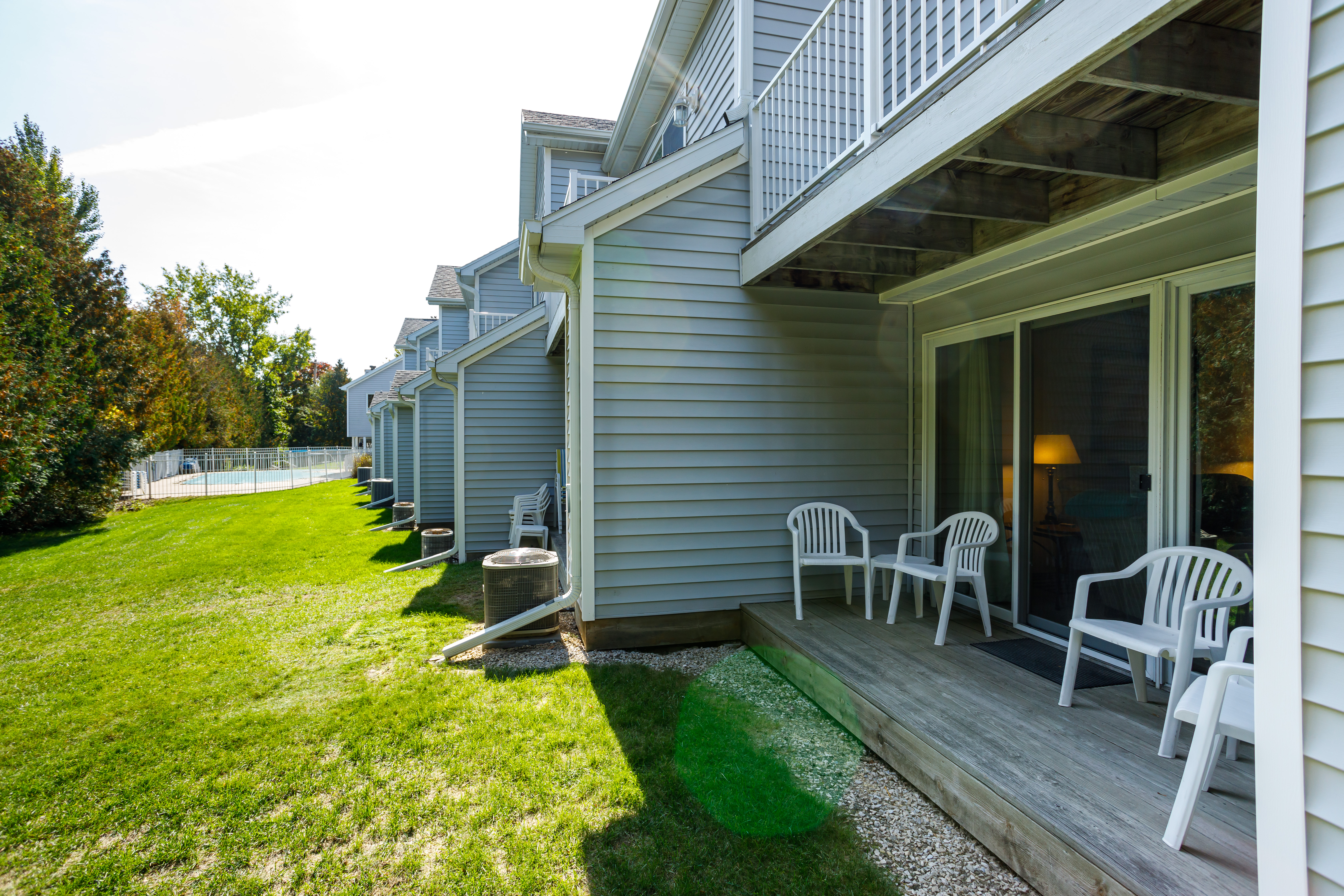 This two-story condo with a private entrance comfortably sleeps six with two upstairs bedrooms and a living room sleeper sofa. The first floor features a half bath, and the full upstairs bath boasts a spacious jetted tub. Want to eat in? Enjoy the fully-equipped kitchen. Catch up at the dining room table or relax in front of the large fieldstone gas fireplace while enjoying your favorite shows on the 52-inch smart TV. Step out onto the private 2nd-floor balcony or 1st-floor deck to enjoy a quiet morning cup of coffee. Take advantage of the heated pool and hot tub on the property, which is open Memorial Day to Labor Day.