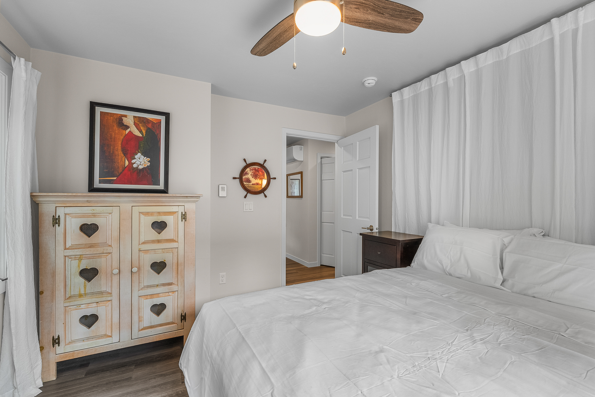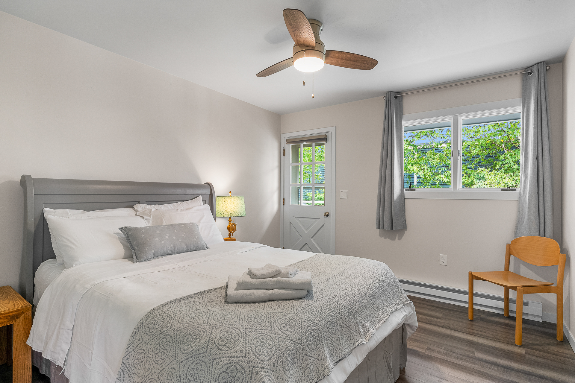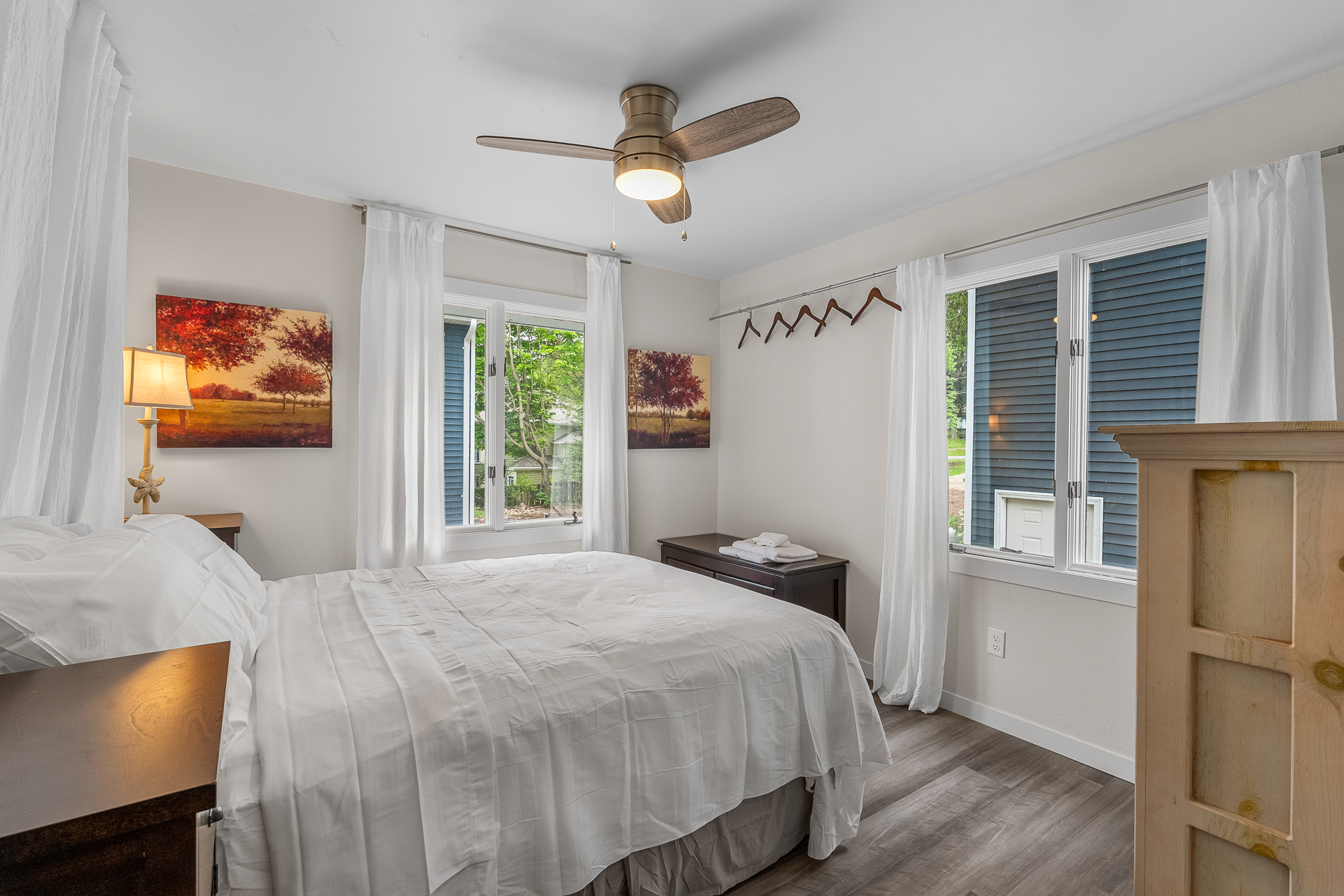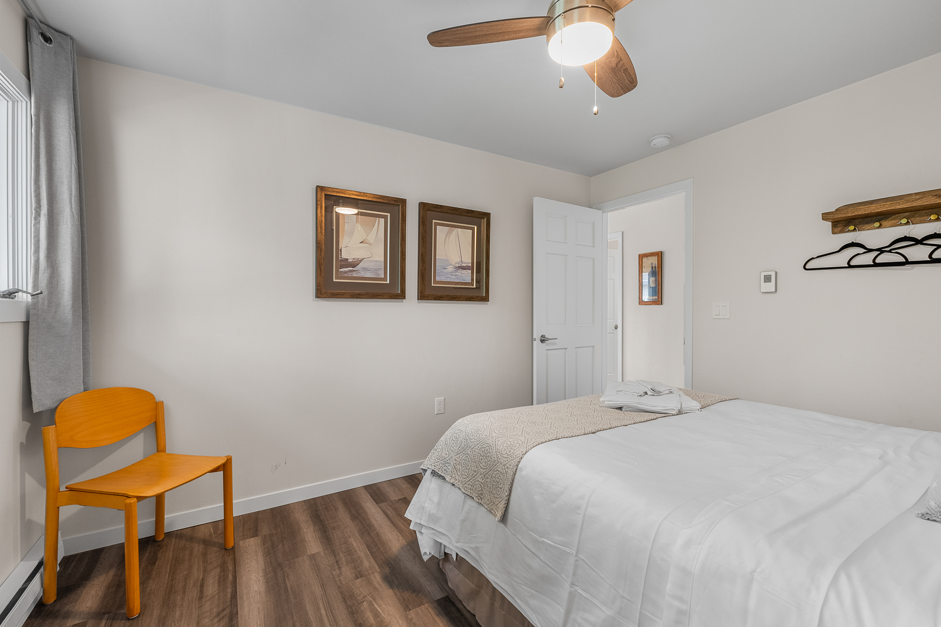 Bedroom 2 (main level): Queen sized bed, ceiling fan, hangers, and extra pillows