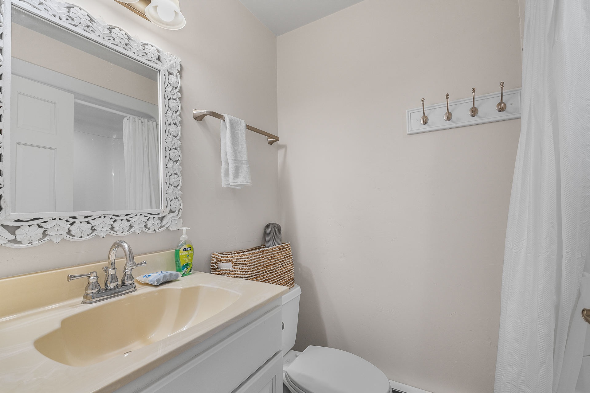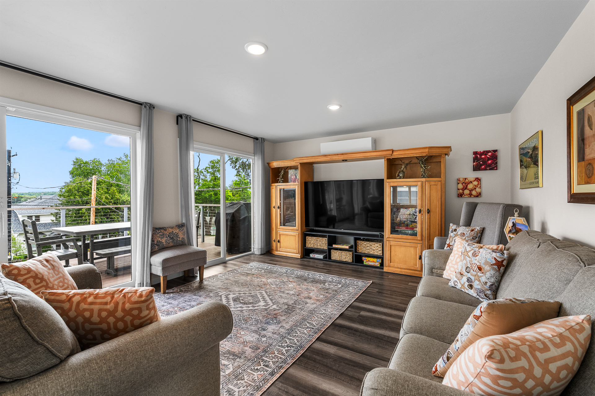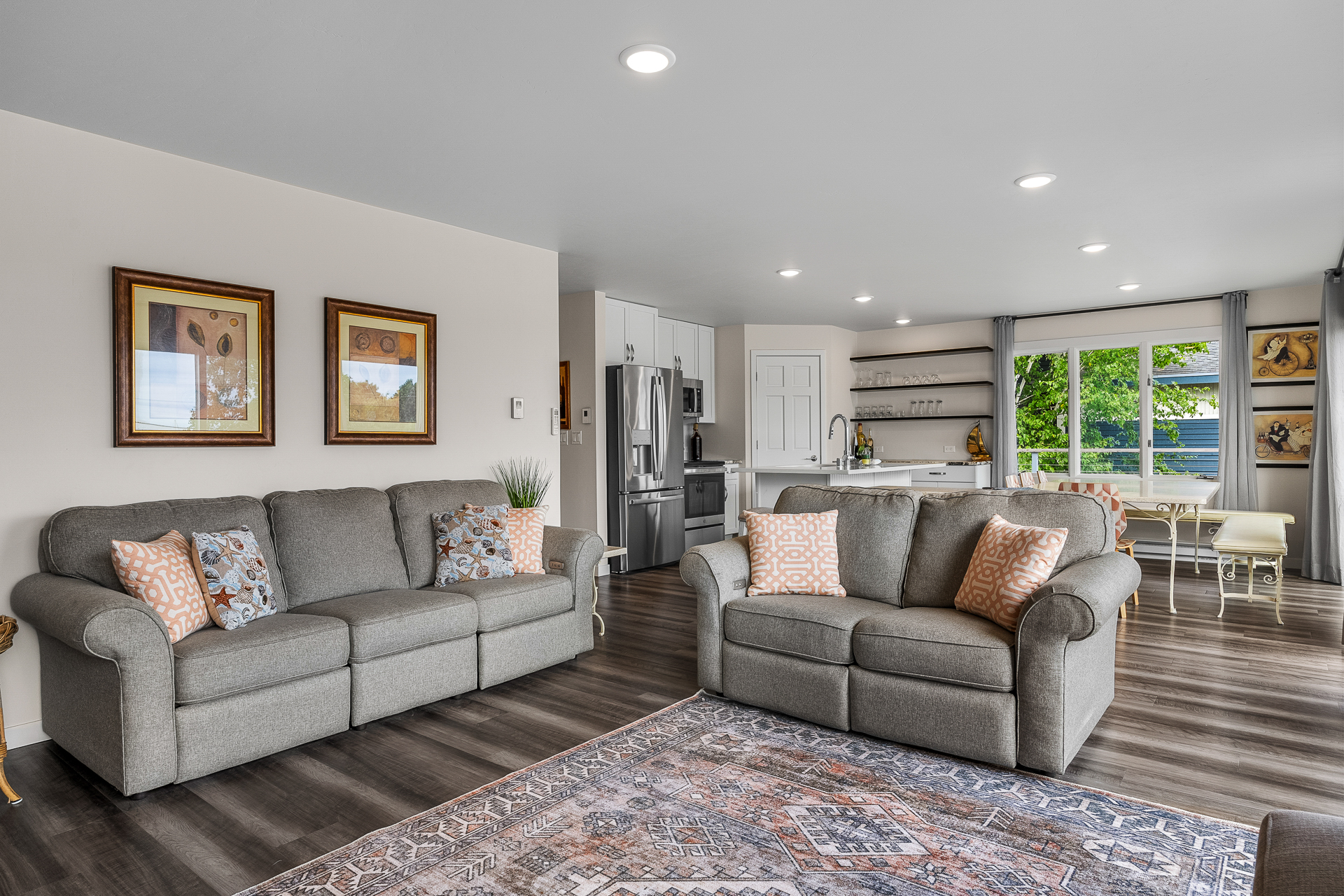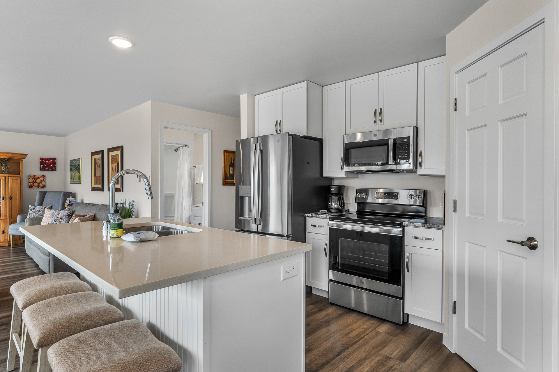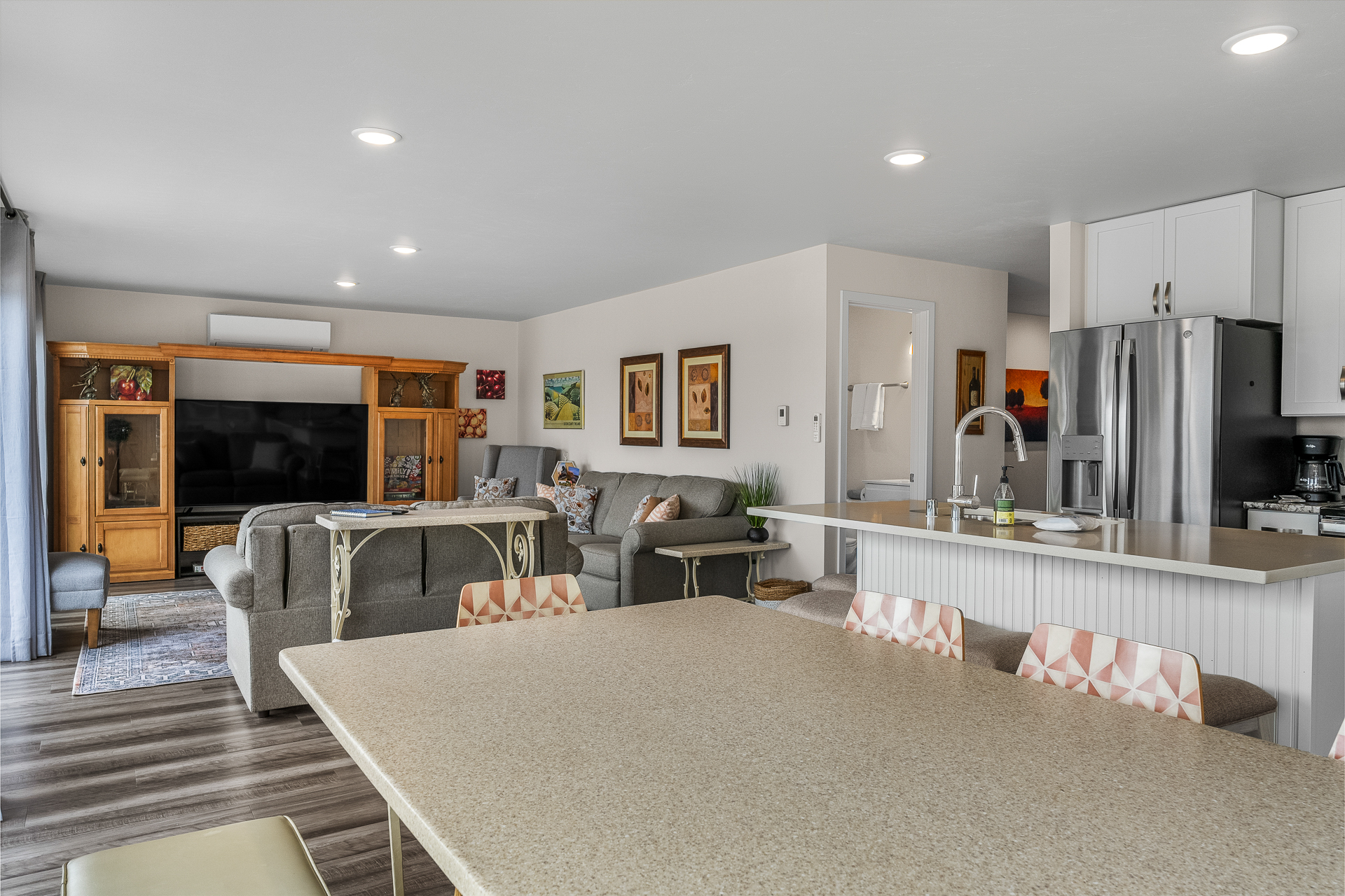 This spacious upper unit has four well-appointed bedrooms, all with queen size beds and three full bathrooms. The fully equipped kitchen includes granite countertops, island seating as well as dining table. The main living space leads to the large patio to soak in the views.