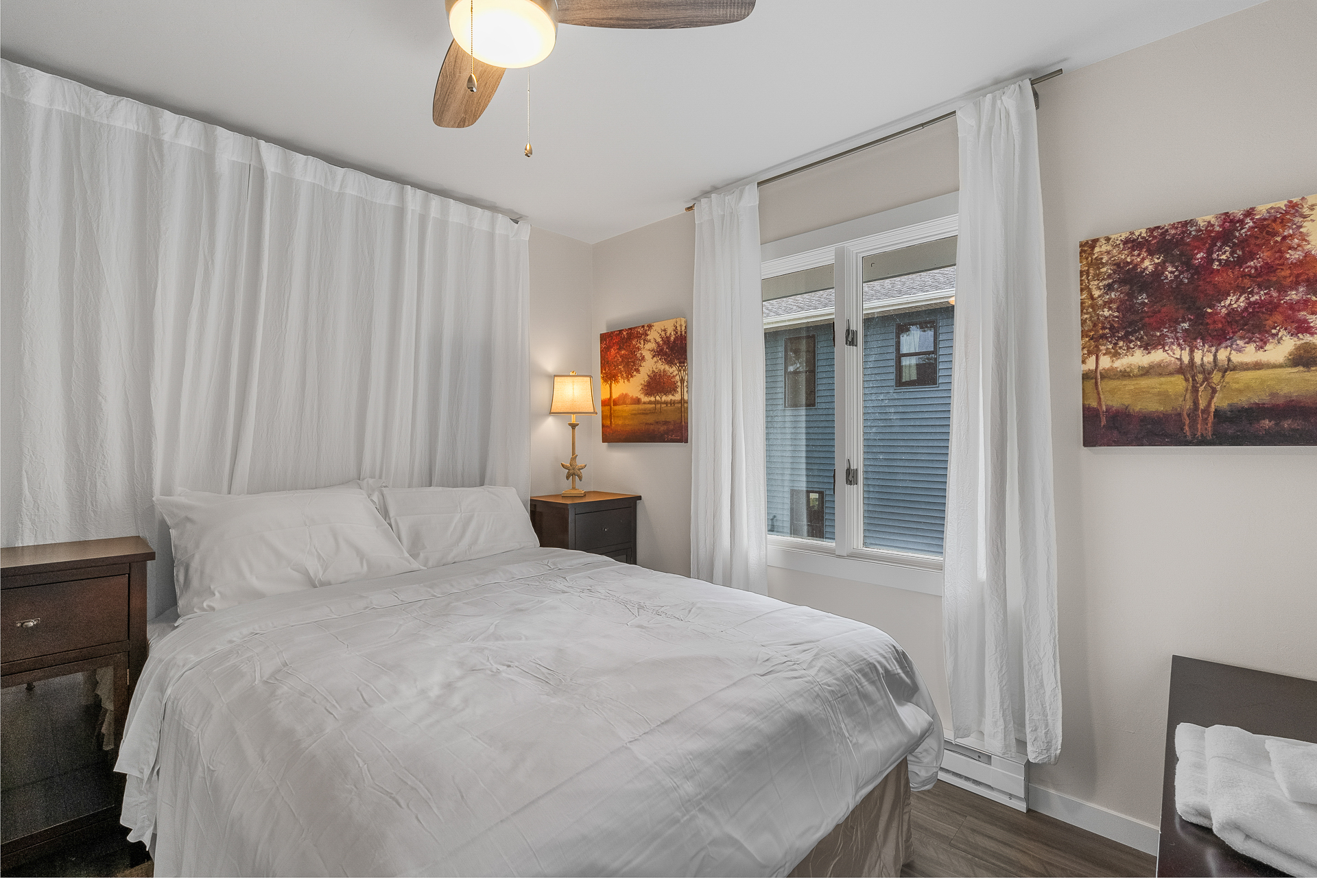 Bedroom 3 (main level): Queen Sized bed, ceiling fan, room darkening shades, hangers, and extra pillows