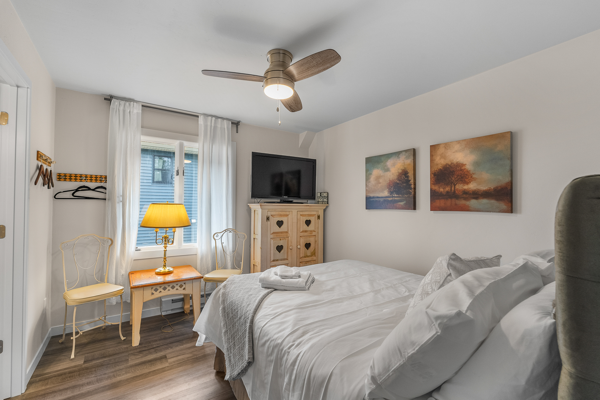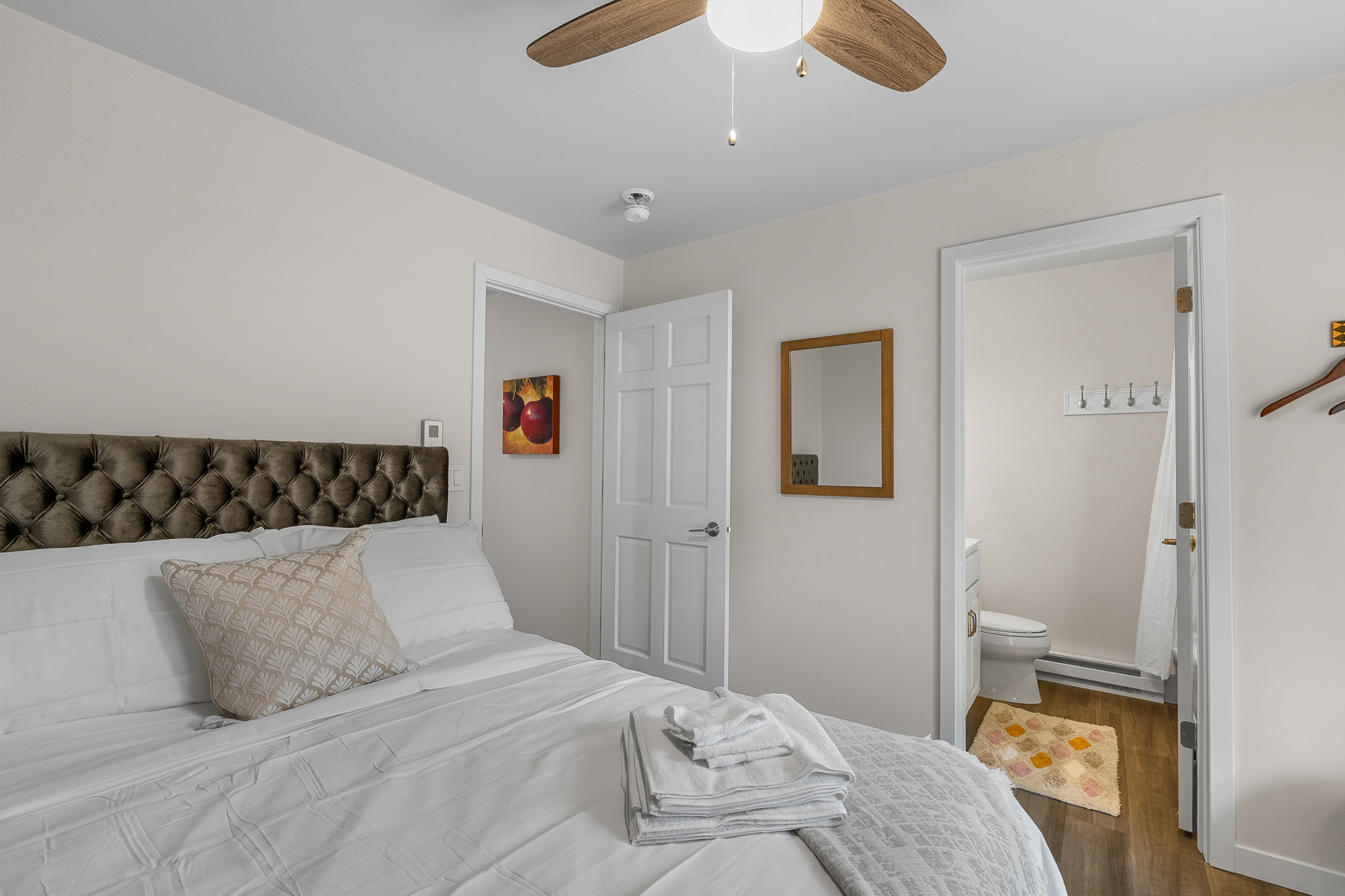 Bedroom 1 (main level): Queen sized bed, Smart TV, ceiling fan, hangers, extra pillows and en suite bathroom