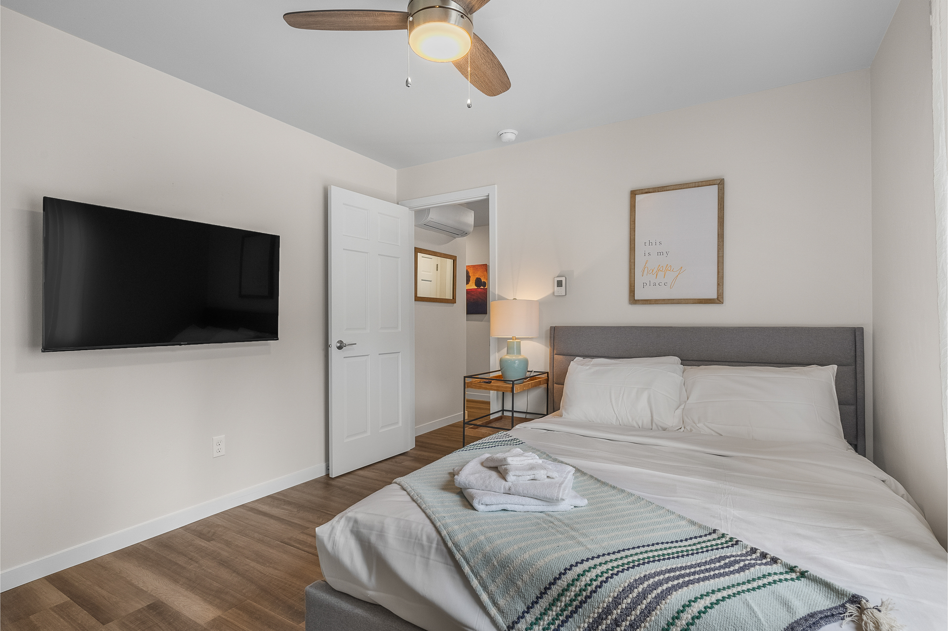 Bedroom 4 (main level): Queen Size bed, Smart TV, ceiling fan, hangers, and extra pillows