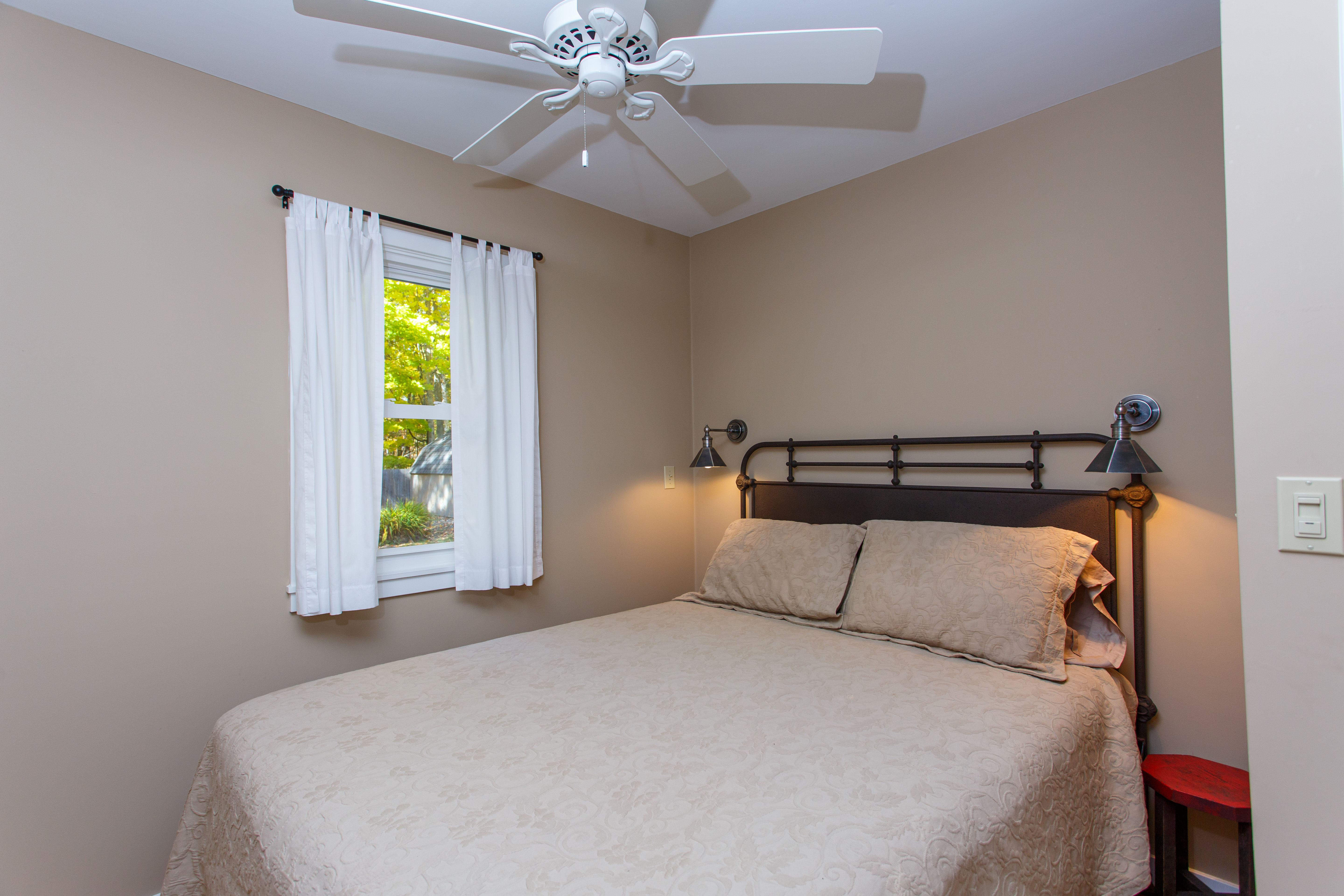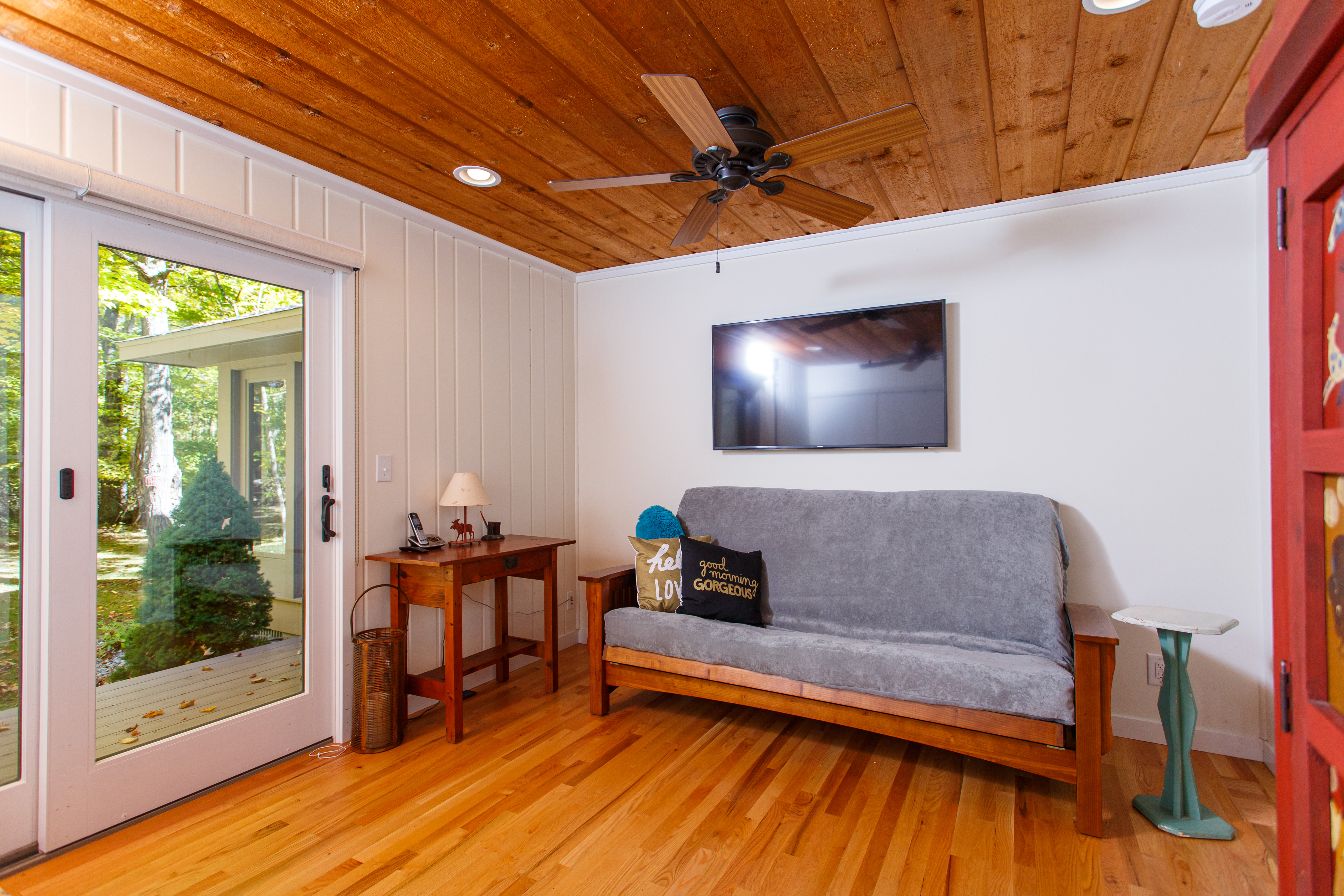 Bedroom 1: King size bed, 2 ceiling fans, Smart TV, futon that could be used for additional sleeping location, private patio doors to yard