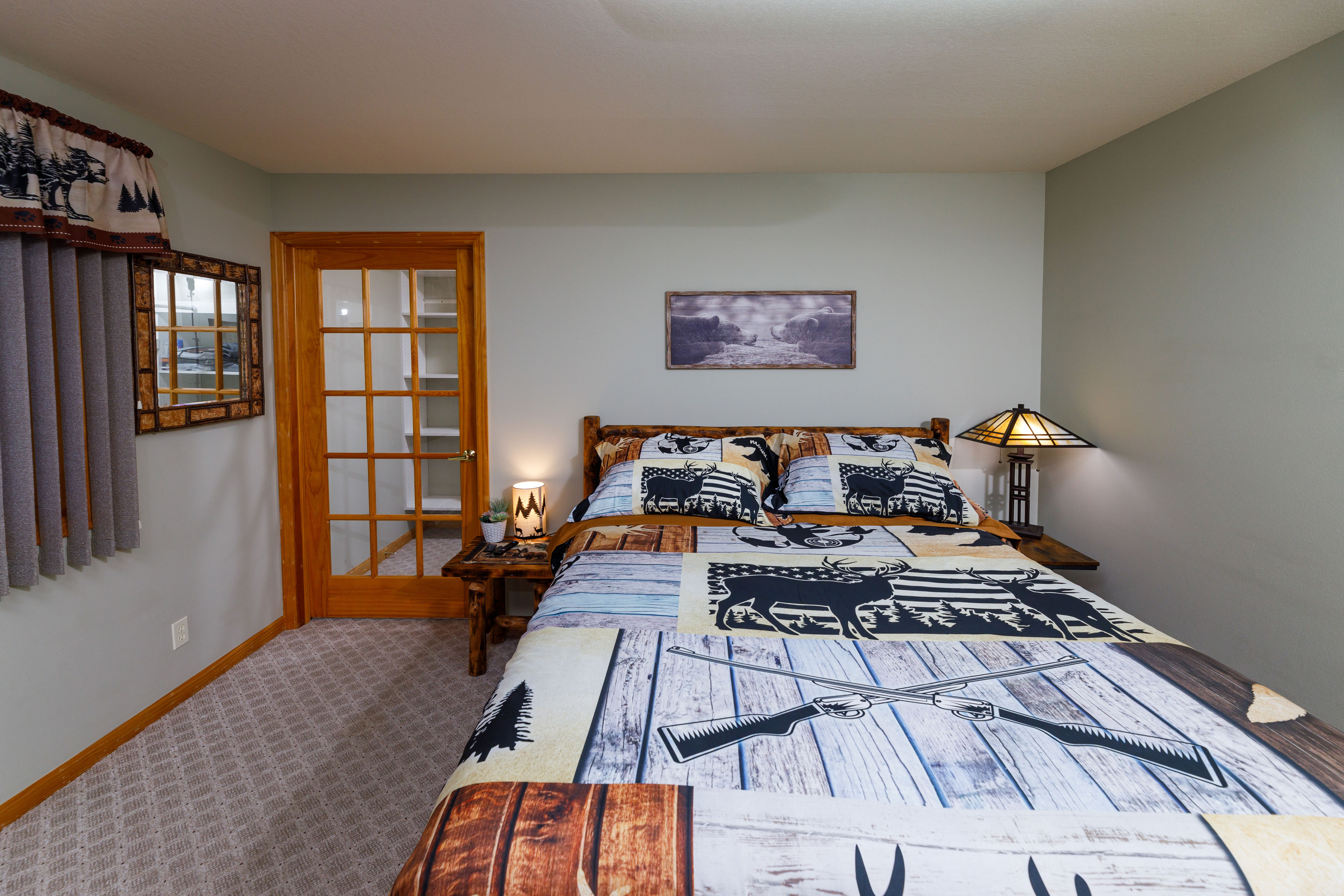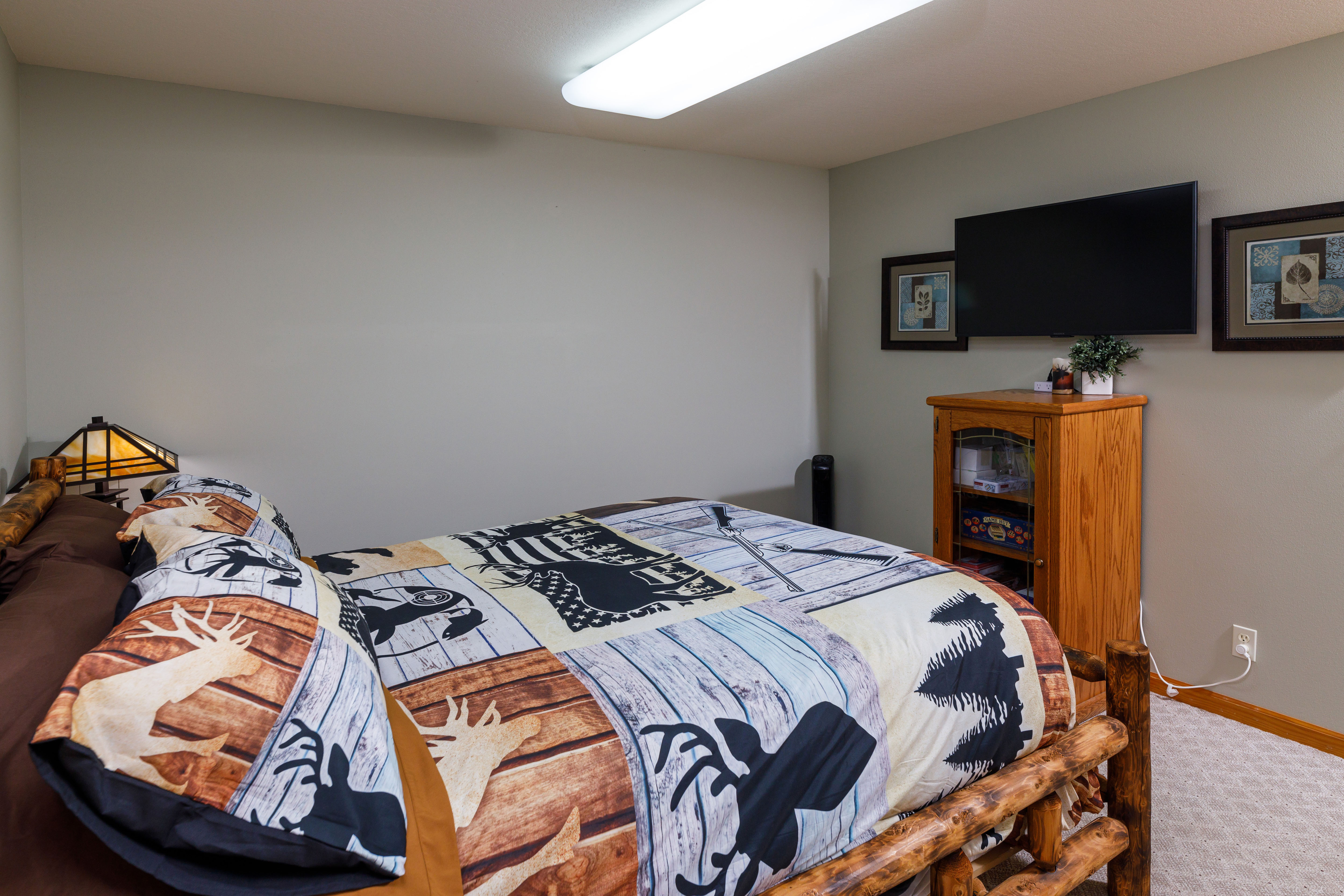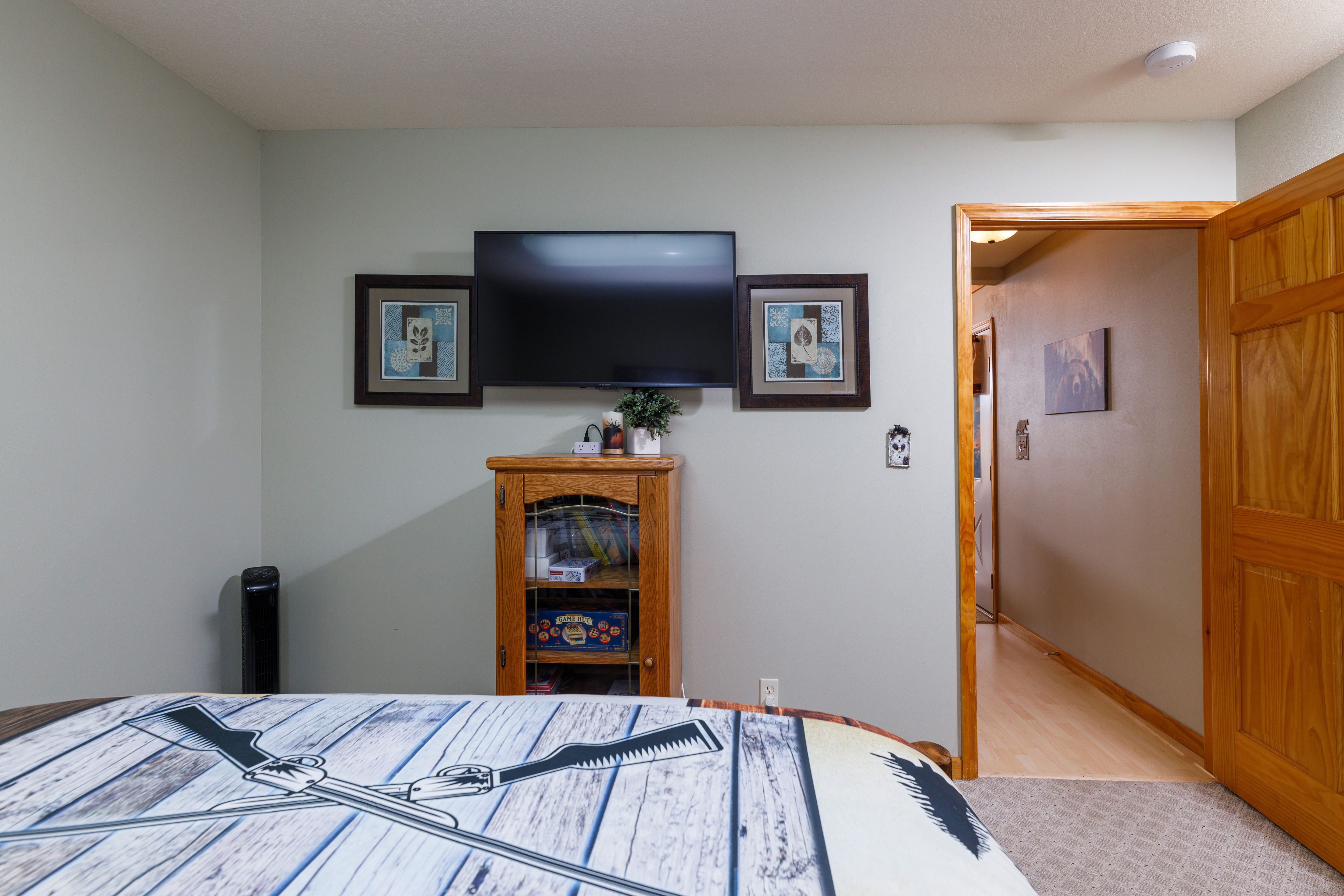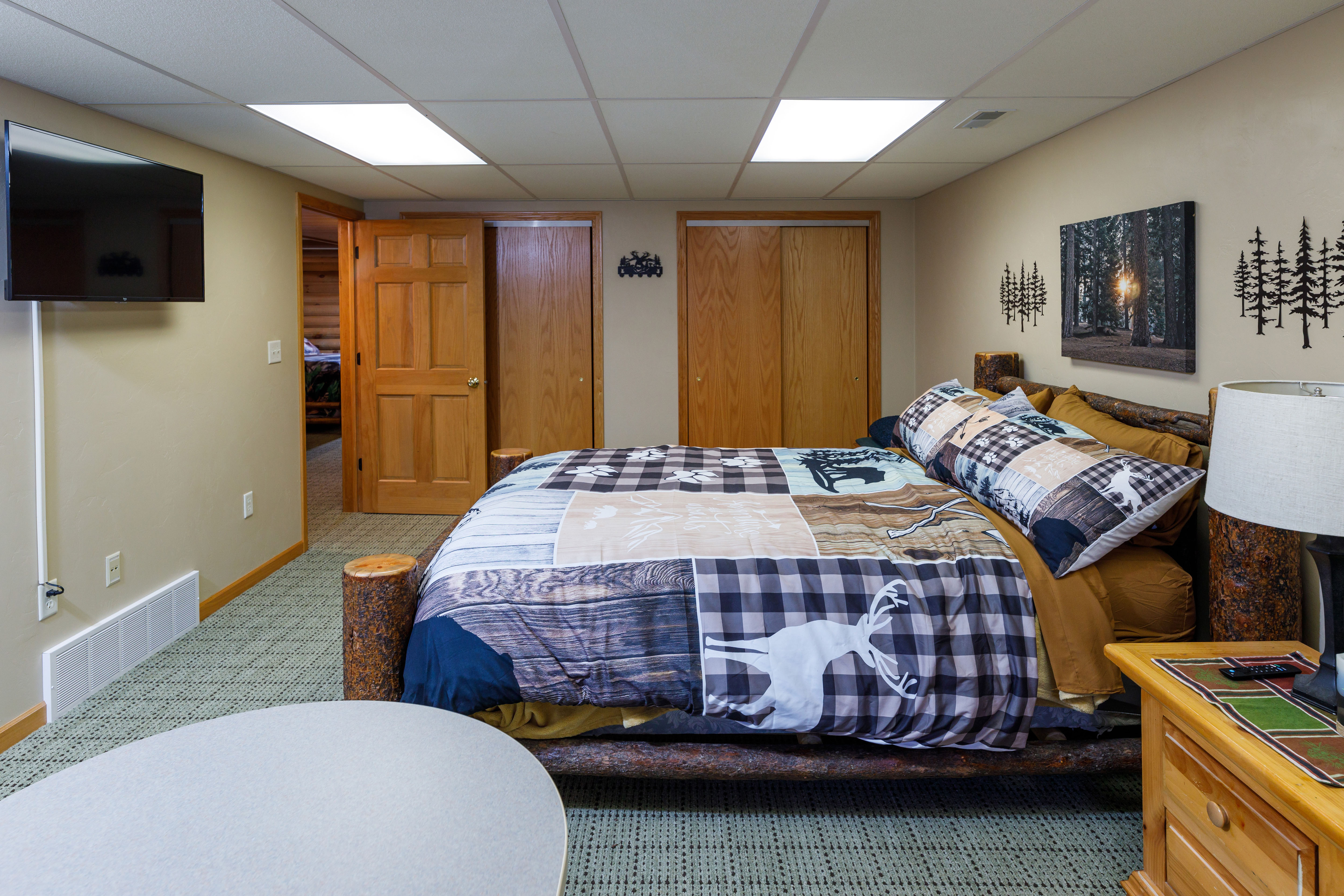 Bedroom 3 (basement): Queen size bed, Smart TV, portable fan, hangers, extra pillows and blankets