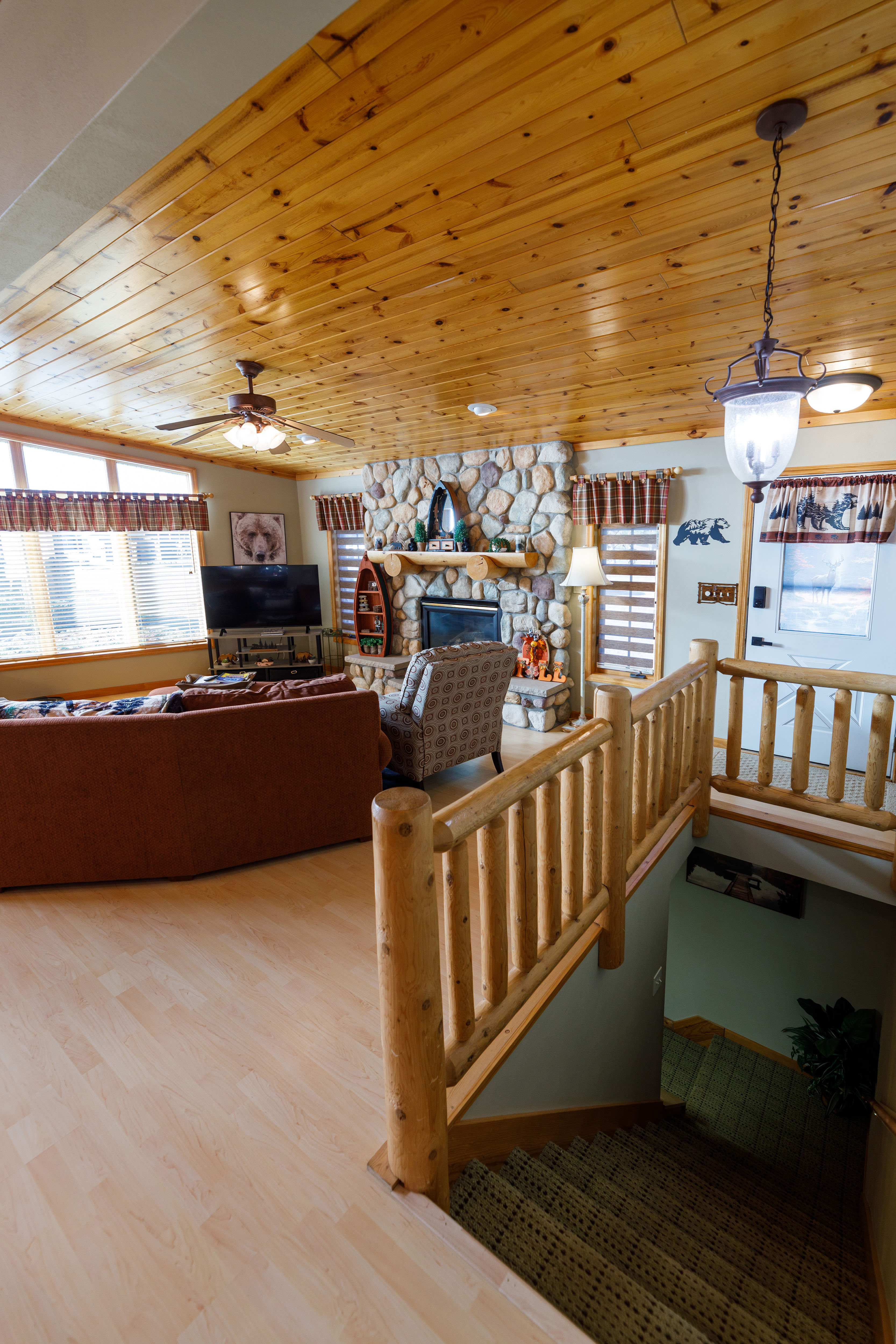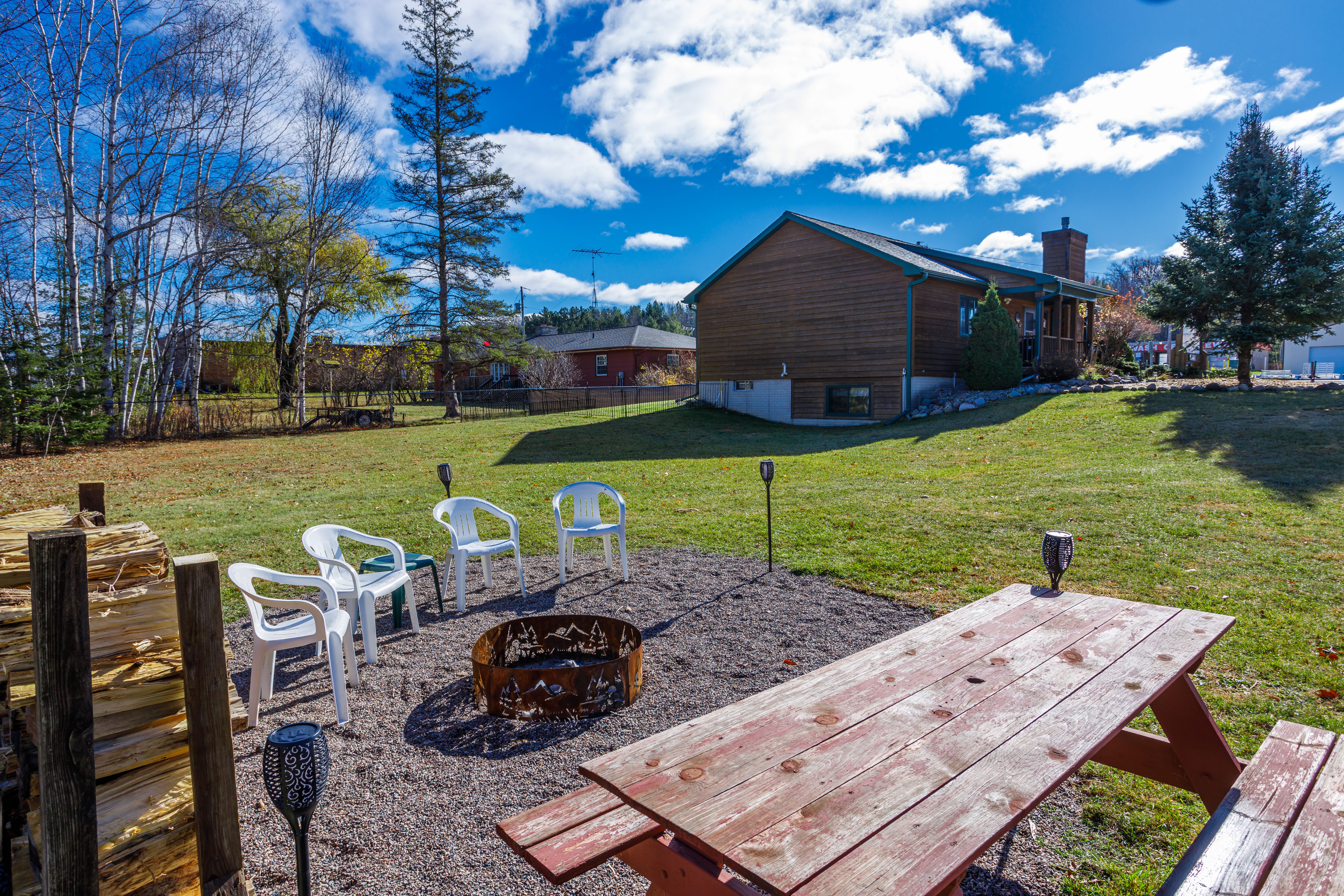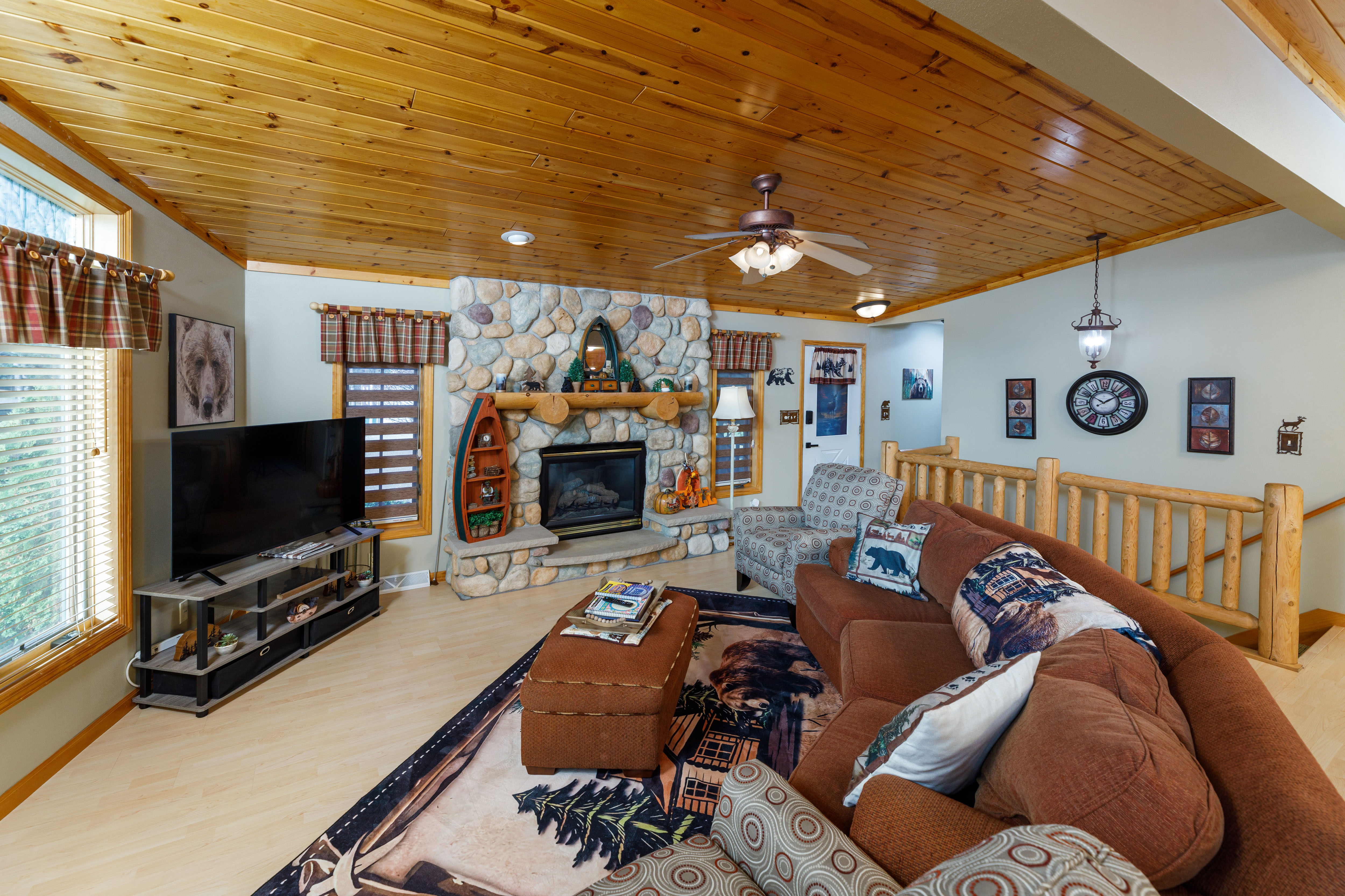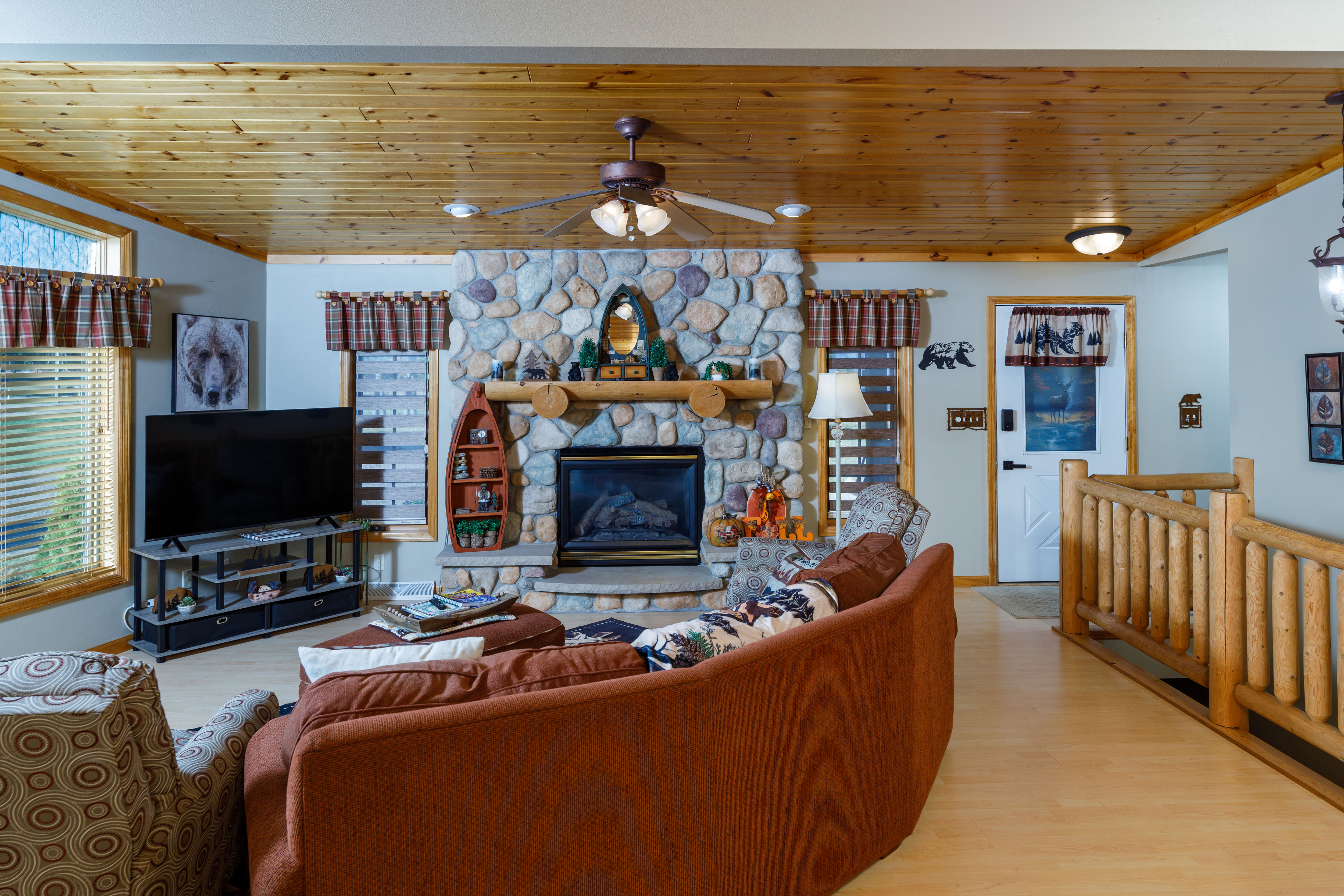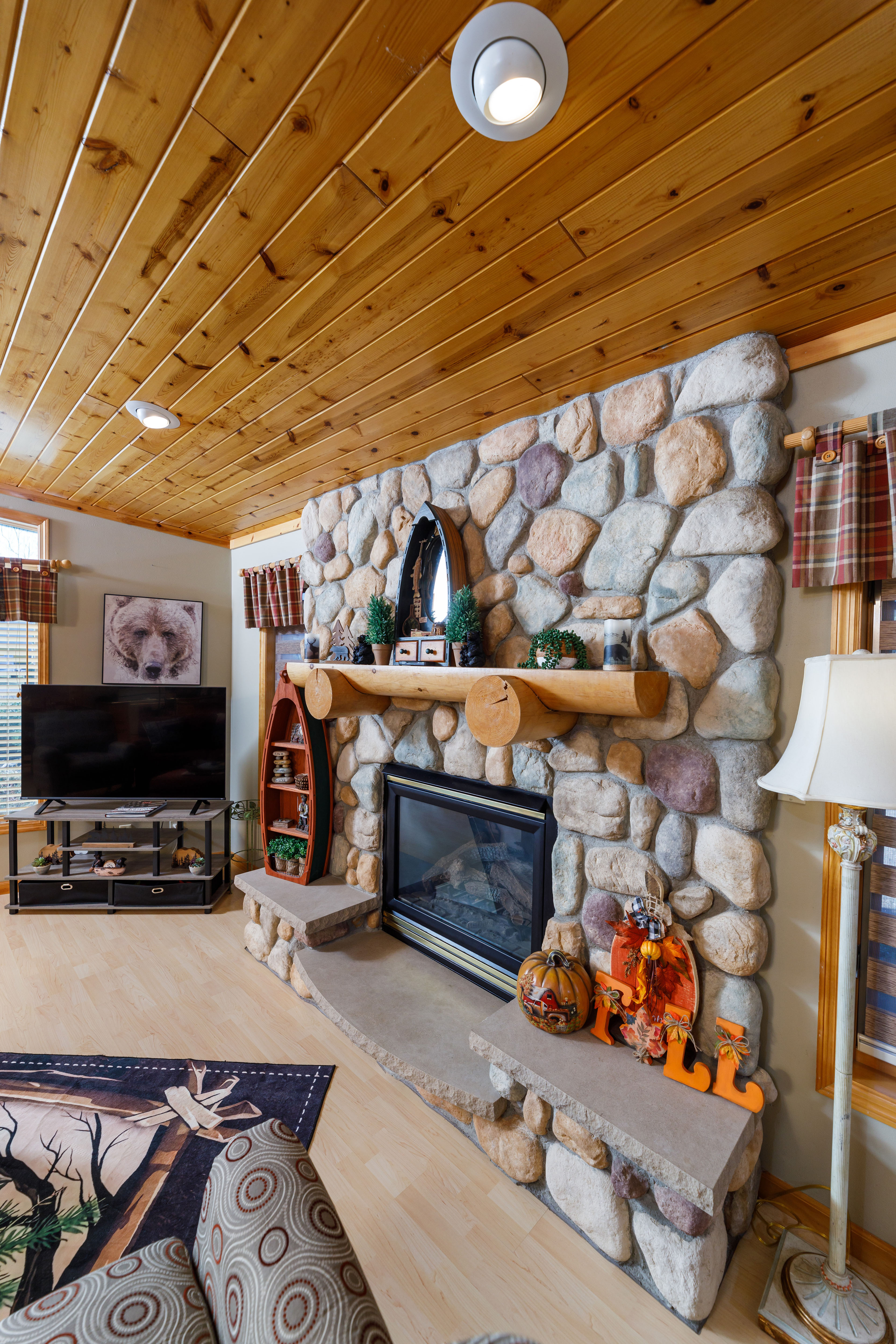 The main level includes a full kitchen, 2-large bedrooms and a full bathroom. It also includes a living room with a beautiful fieldstone gas fireplace and raised hearth. The lower level includes a full bathroom with walk-in shower and family room with a Smart TV. The basement also has bedroom 3 with a queen bed, Smart TV, two closets, and mirror/makeup area, along with office desk with printer. The bonus sleeping area is in the basement living room. It has one queen bed and two twin beds as well as a couch, lounger, and TV. Outside, you will find a fire pit and both a front and back deck/porch. There is also propane grill in a small fenced in area of the yard.