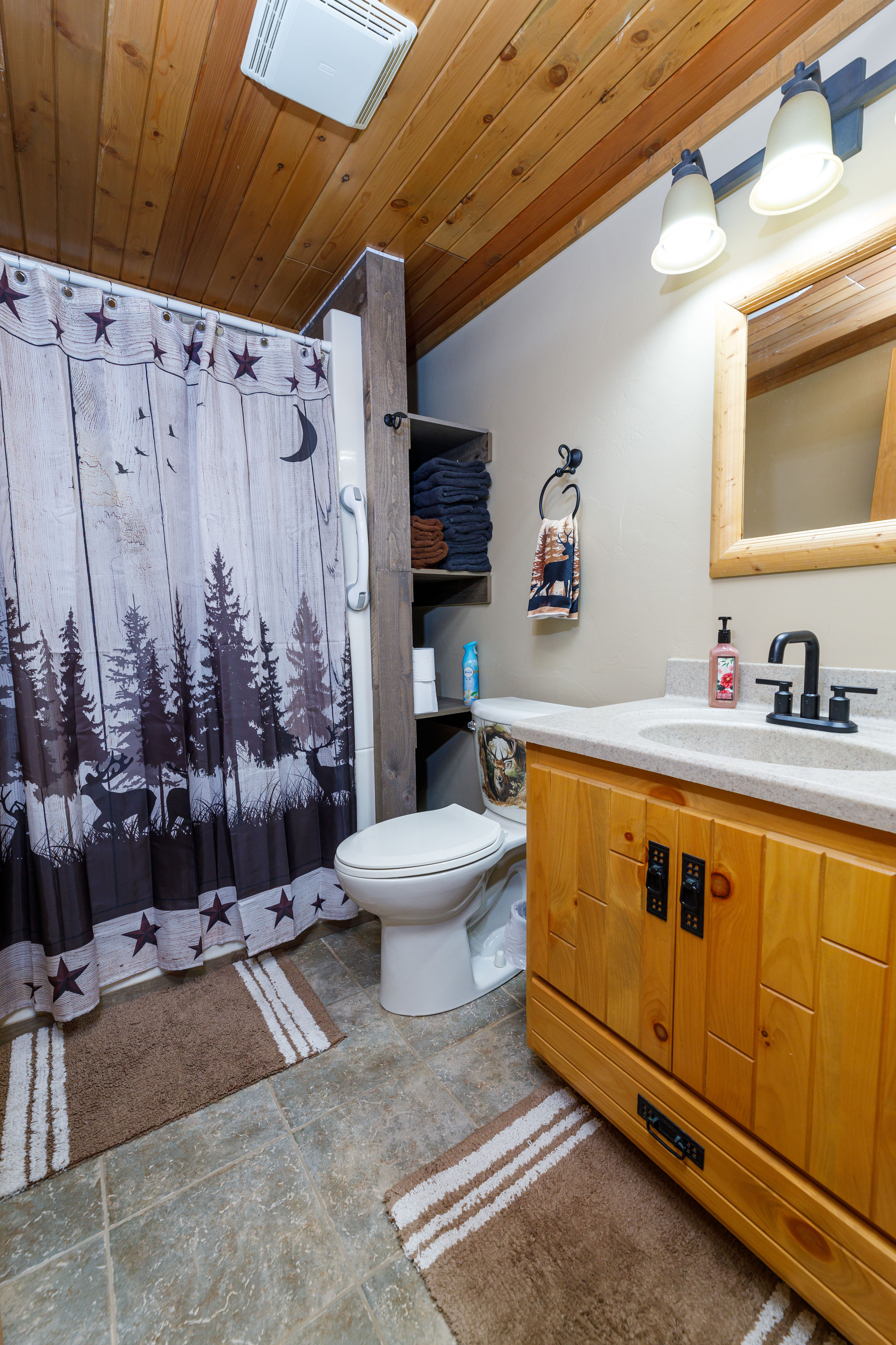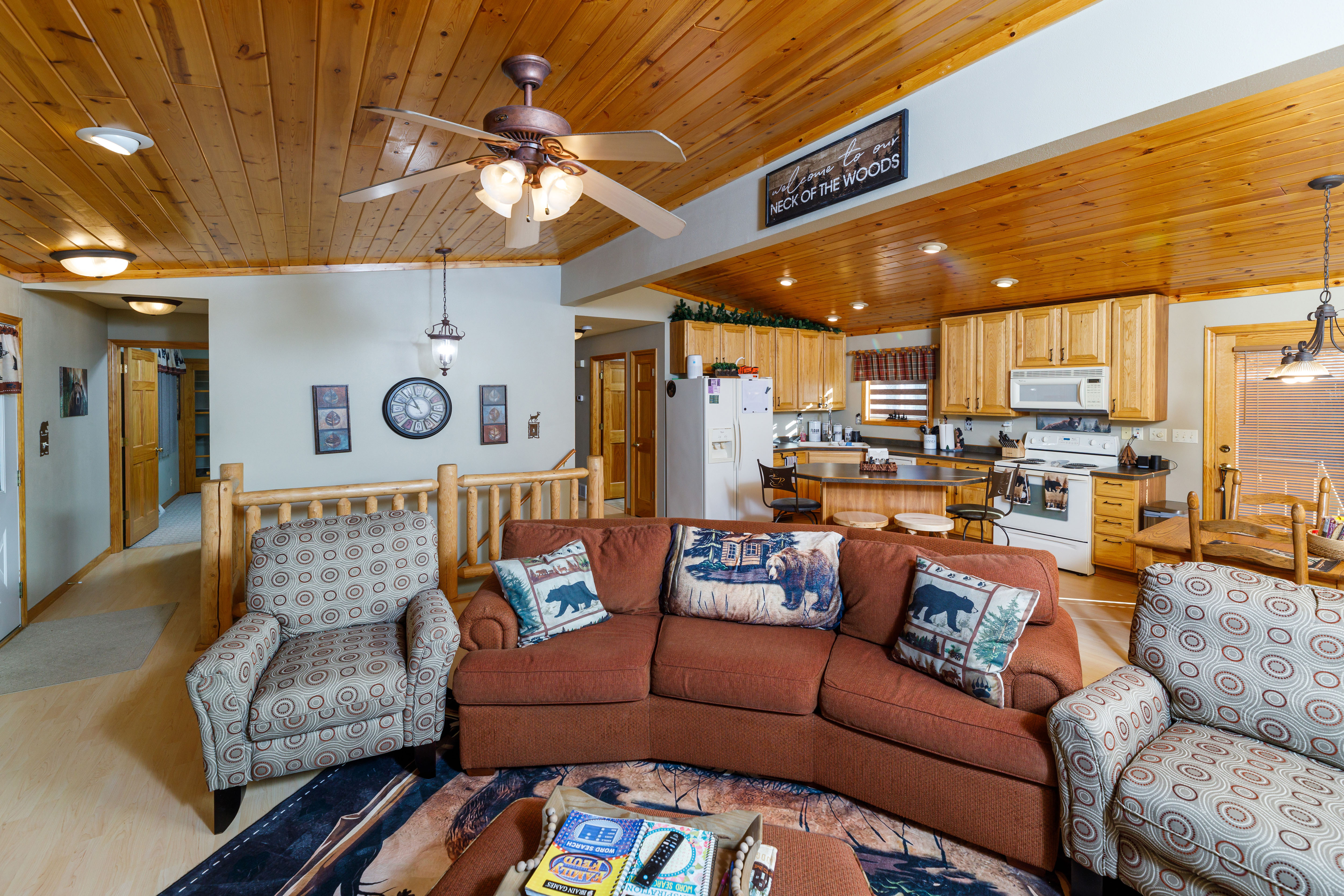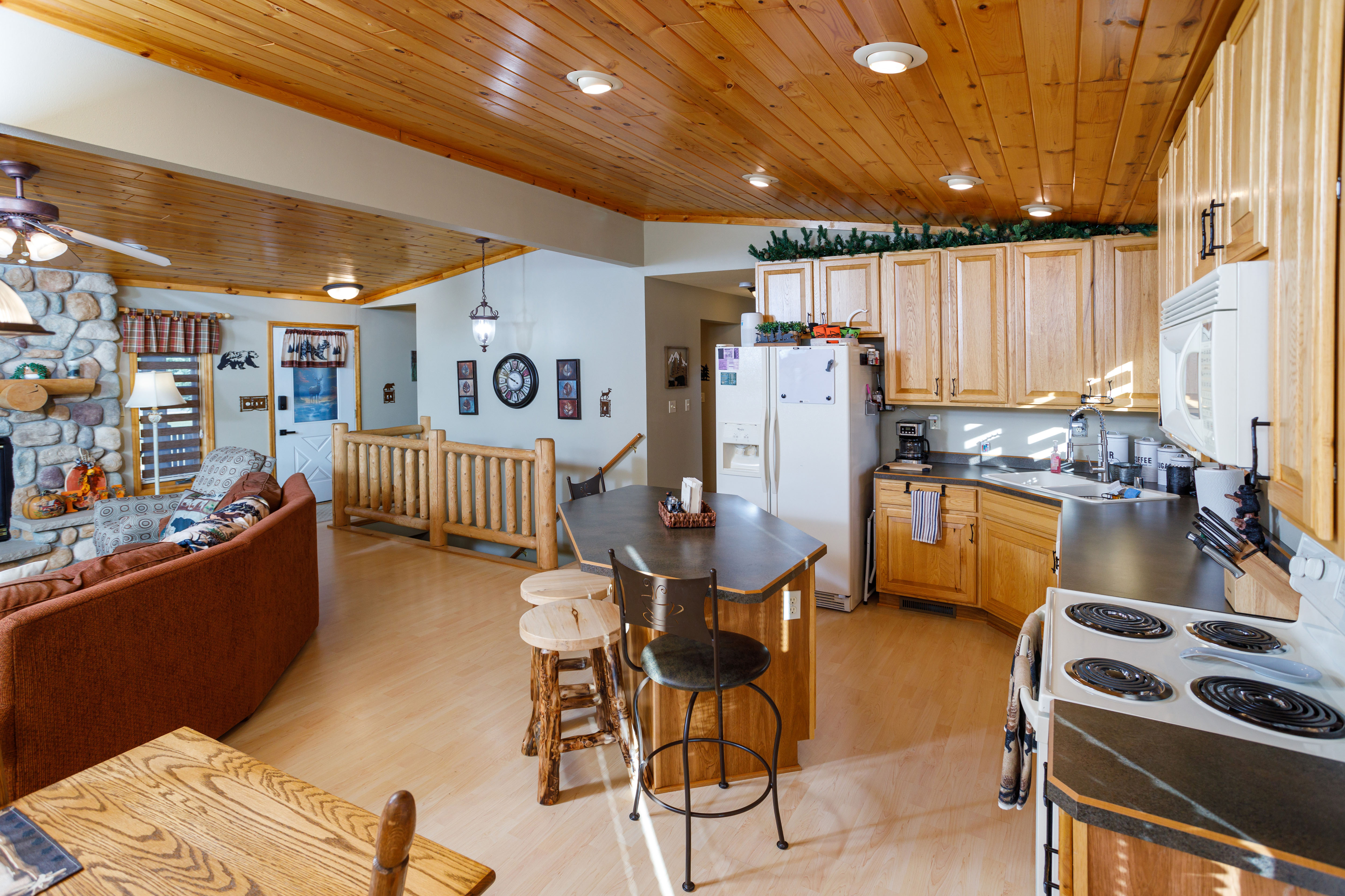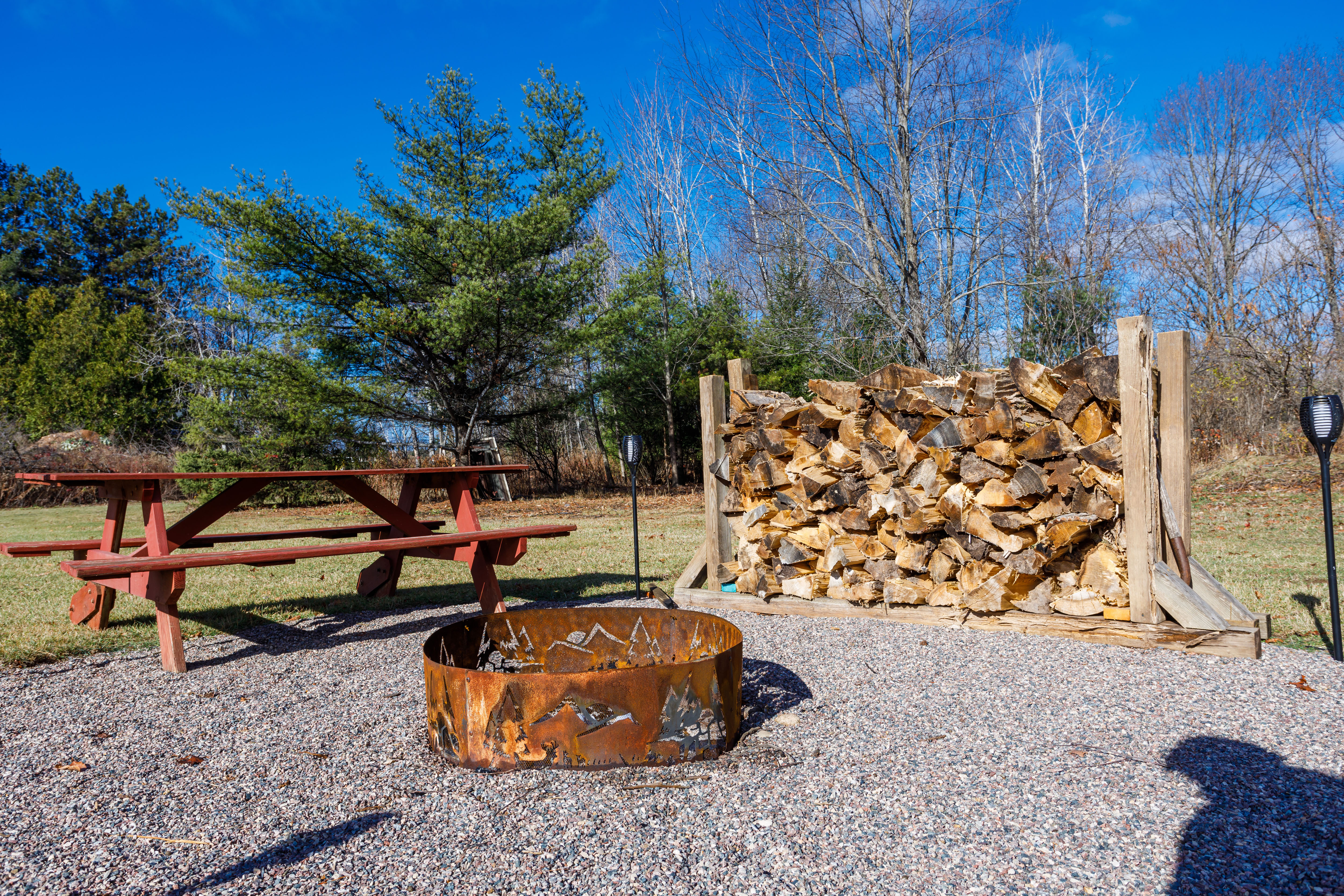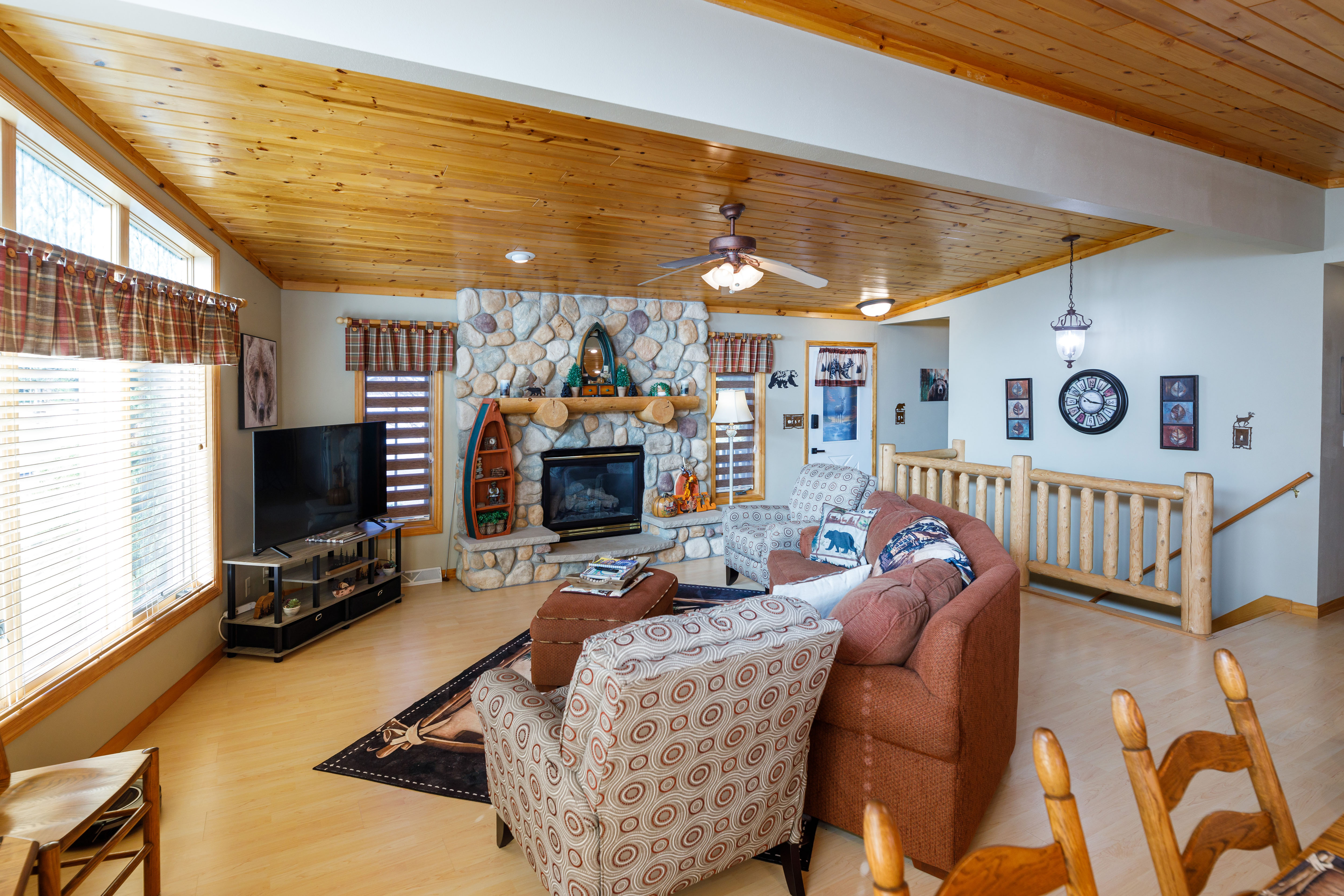 The main level includes a full kitchen, 2-large bedrooms and a full bathroom. It also includes a living room with a beautiful fieldstone gas fireplace and raised hearth. The lower level includes a full bathroom with walk-in shower and family room with a Smart TV. The basement also has bedroom 3 with a queen bed, Smart TV, two closets, and mirror/makeup area, along with office desk with printer. The bonus sleeping area is in the basement living room. It has one queen bed and two twin beds as well as a couch, lounger, and TV. Outside, you will find a fire pit and both a front and back deck/porch. There is also propane grill in a small fenced in area of the yard.