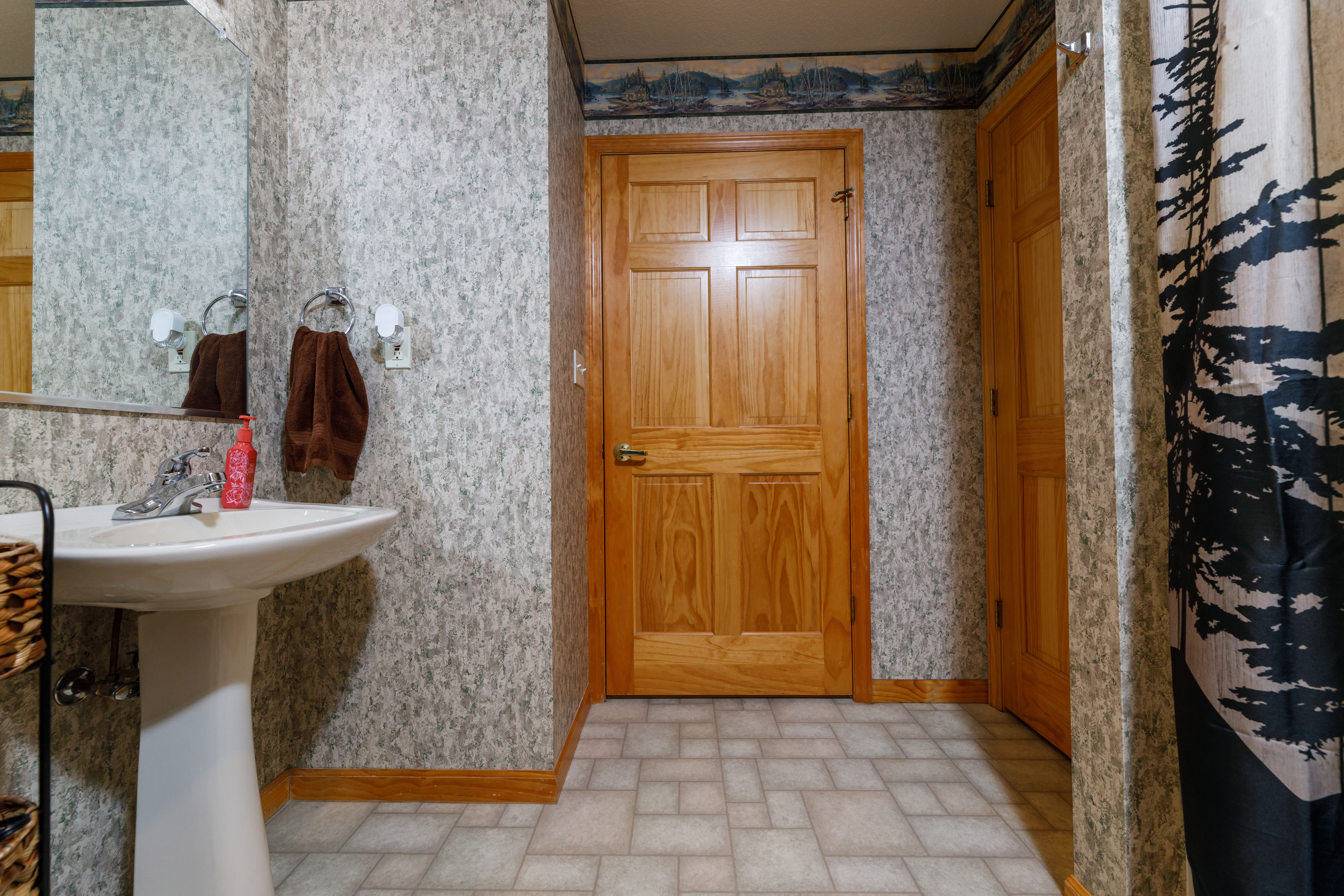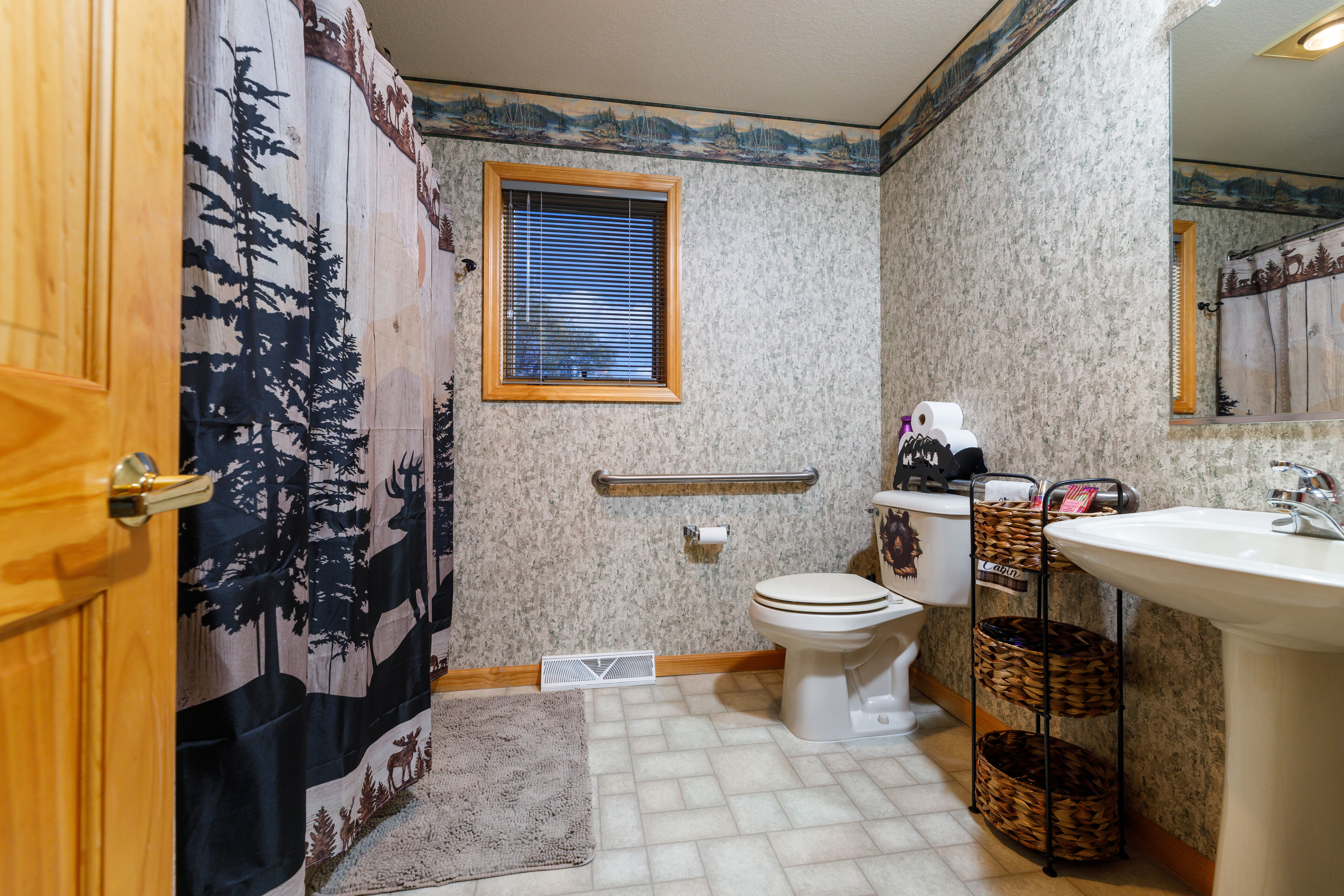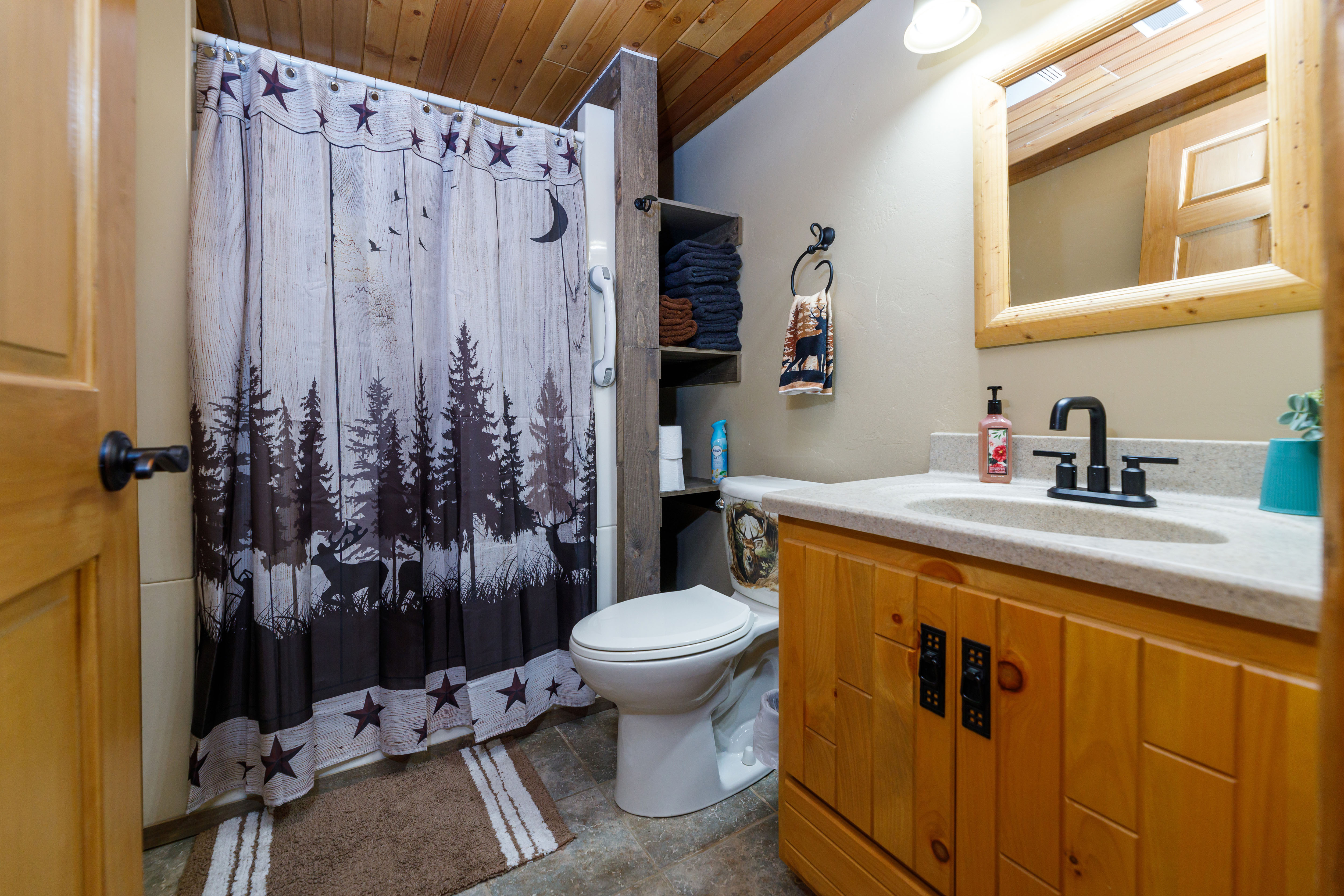 Bathroom 2 (basement): Full bathroom with walk-in shower, hair dryer