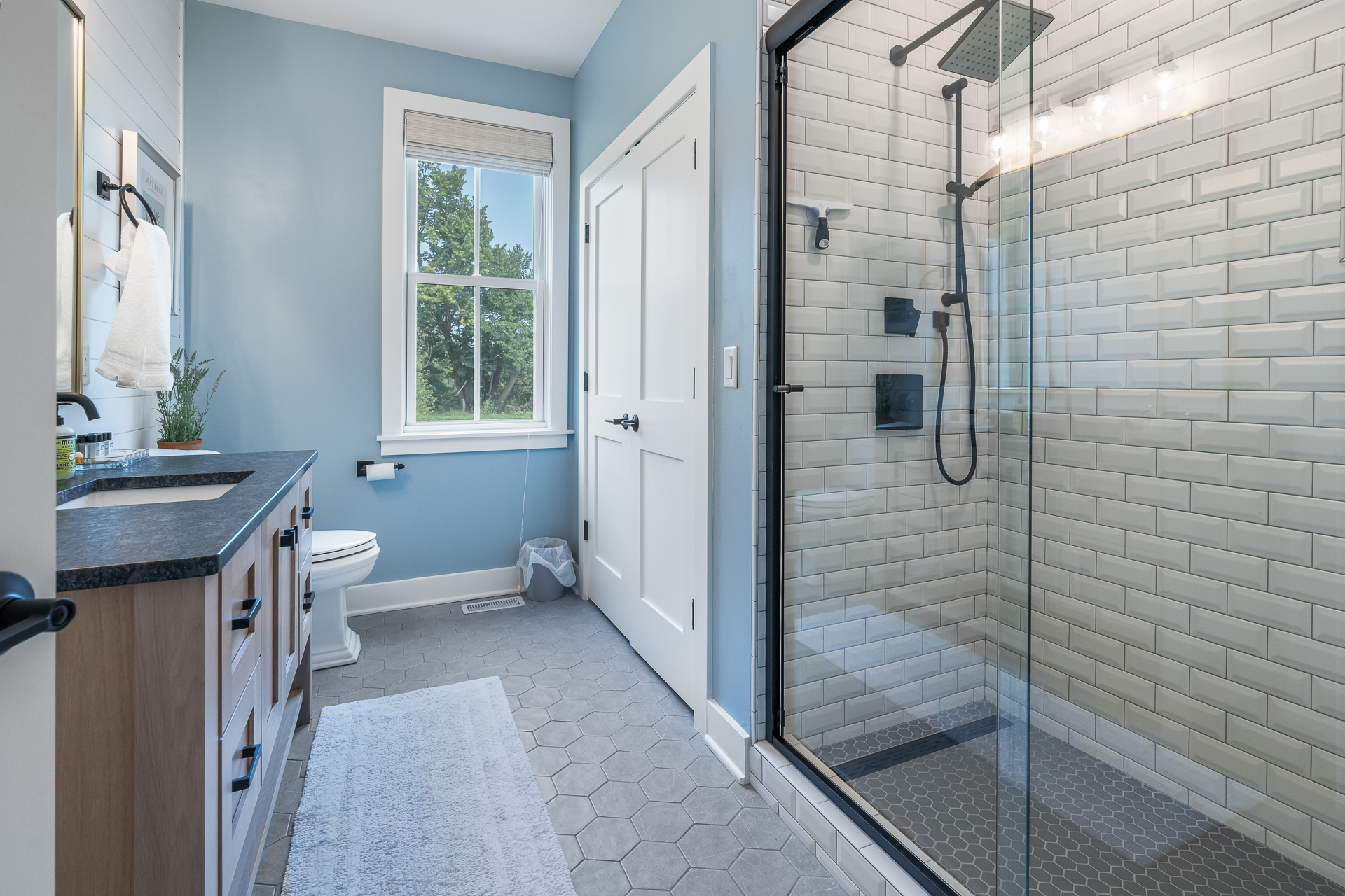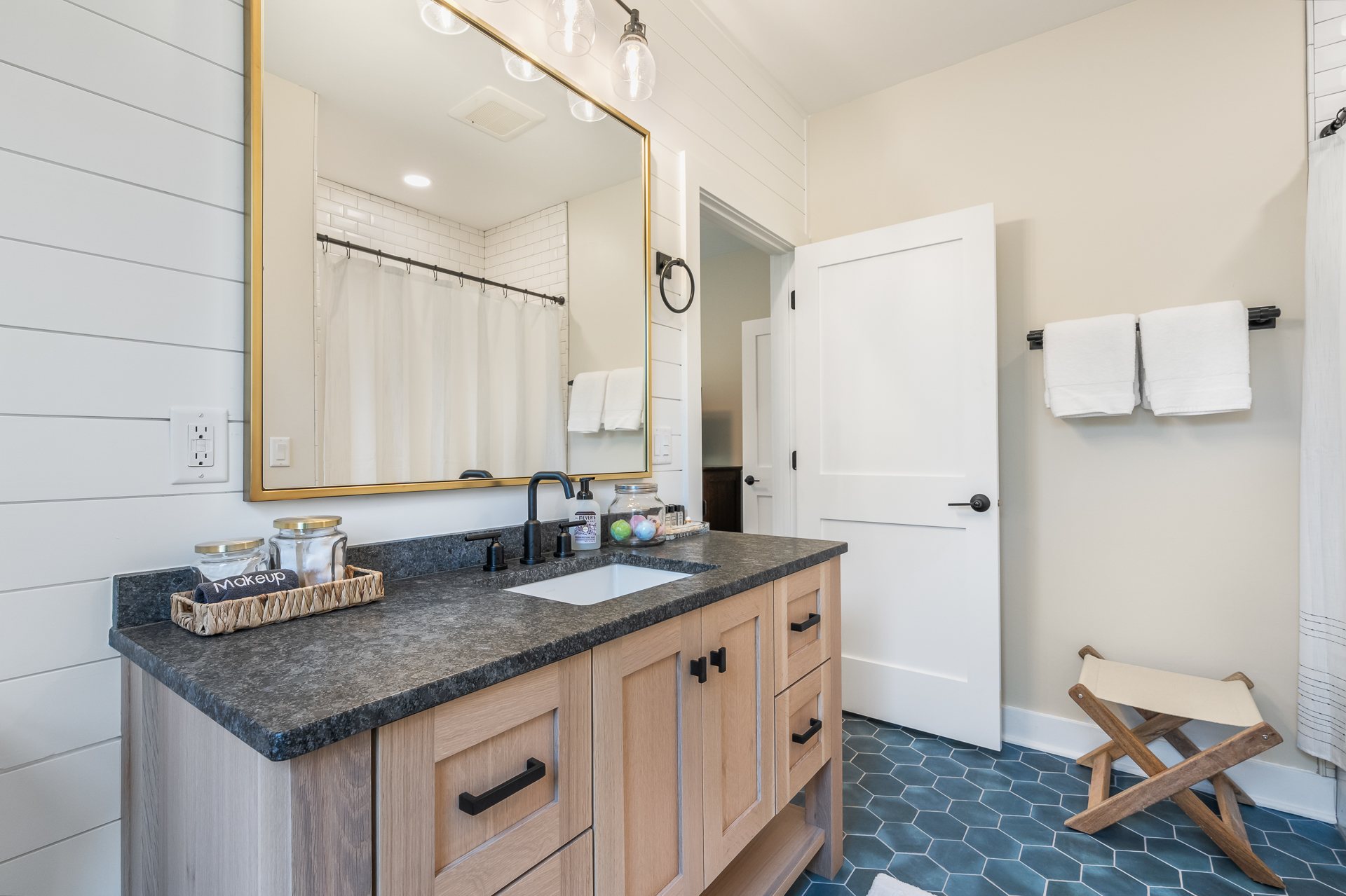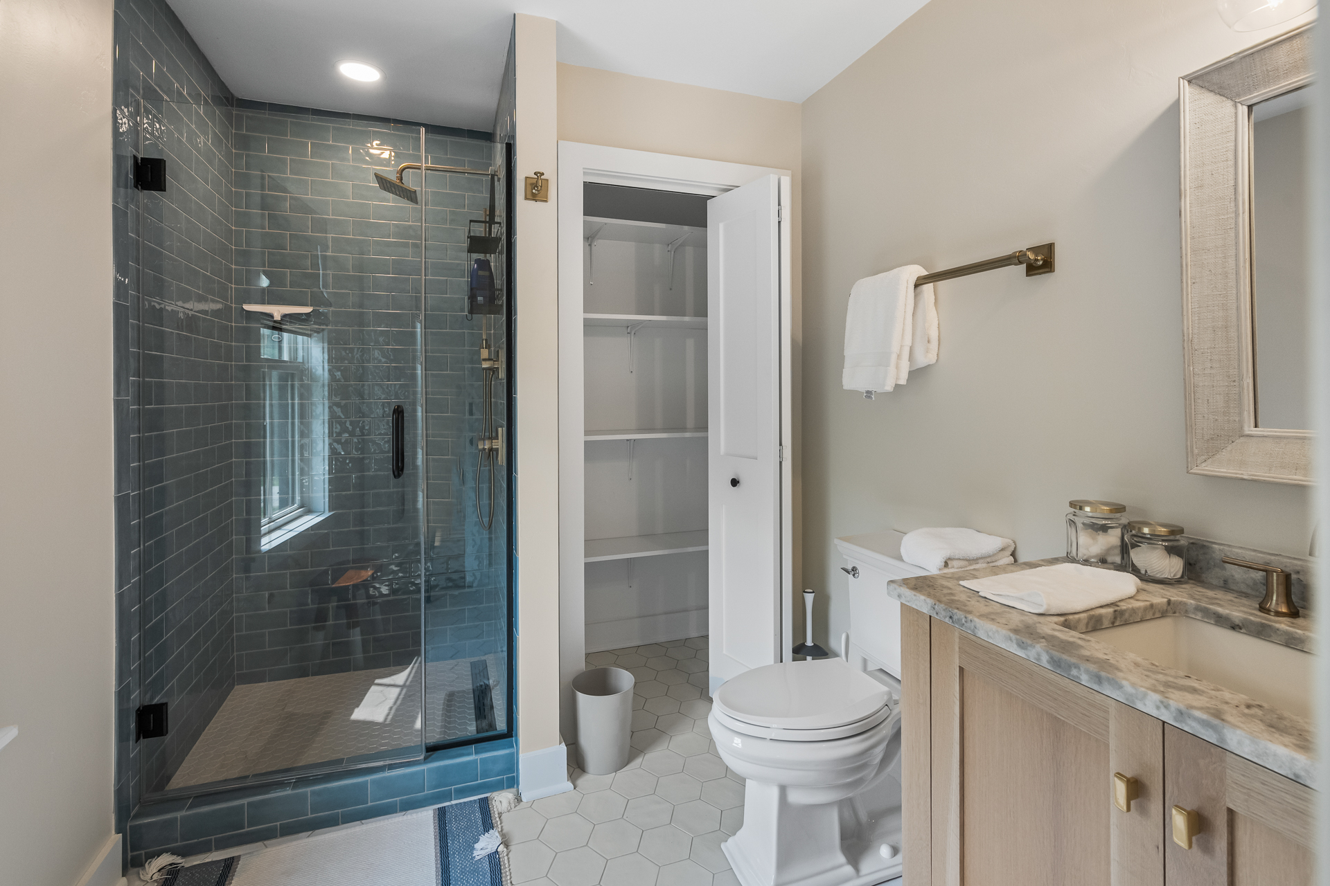 Bathroom 4 (upper level): Full bathroom with walk-in shower and hair dryer