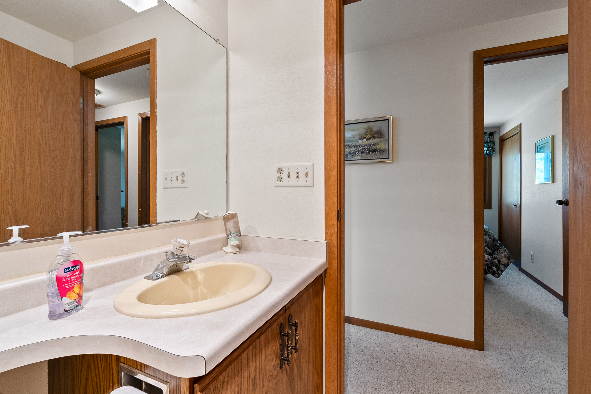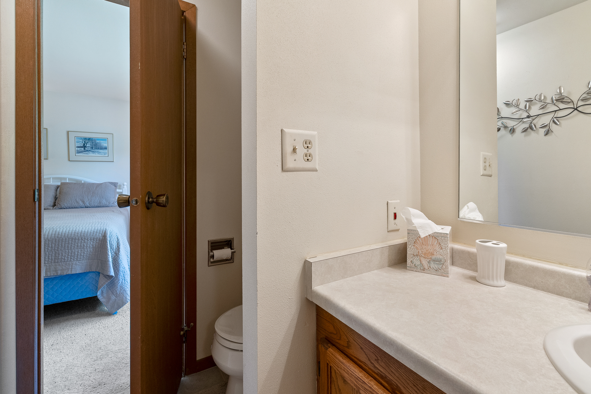 Bathroom 2: Half bathroom with toilet, sink and hair dryer, ensuite to bathroom 1