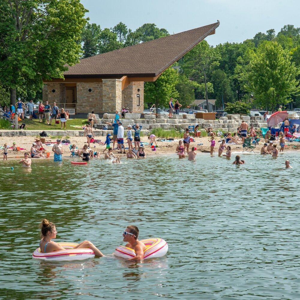 A family-friendly destination offering a sandy shoreline, swimming pier, and playground, making it ideal for a day of recreation.
